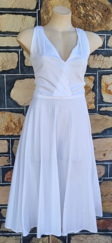 The flat lay bust is 100cm, the waist is 80cm and the length is 118cm, it has a sunray pleat skirt, and the fabric is polyester jersey.