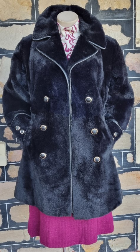 1970’s Faux Fur, Leather Trim, 3/4 length coat, Black, size 12