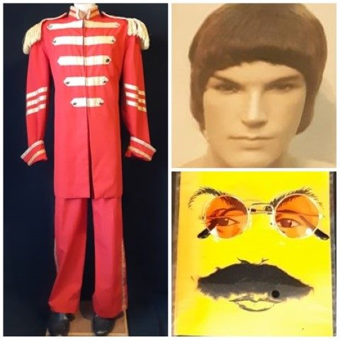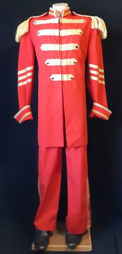 St.Peppers inspired suit, Red, poly/cotton, with wig, sunnies and mustache.