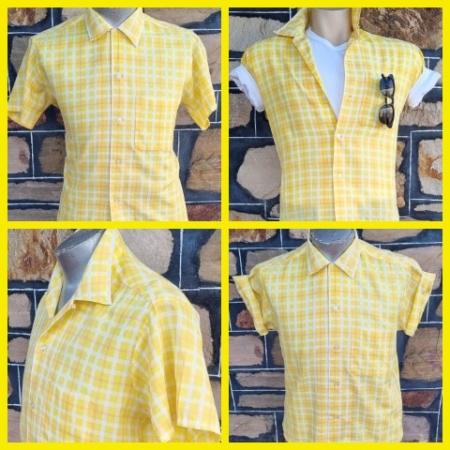 Men’s 1950’s Garage Shirt, yellow check, poly/cotton, by ‘Permanent Press’, USA, size M