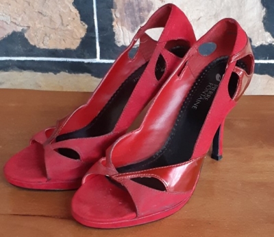 High heels, Red, Suede/patent open toe, synthetic fabric by ‘Pierre Fontaine’ size 8