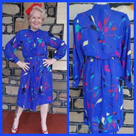 1980’s, Long sleeved dress by ‘Skite’, bright blue print, polyester, size 10-12