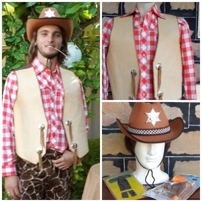 Cowboy Costume, shirt, vest, hat, neck tie & toy guns, cotton/ leather/synthetic, USA, size L-XL