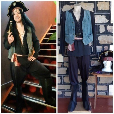 Pirate Costume, pants, shirt, vest, boot covers, sash, gun, wig & Hat, size M-XL