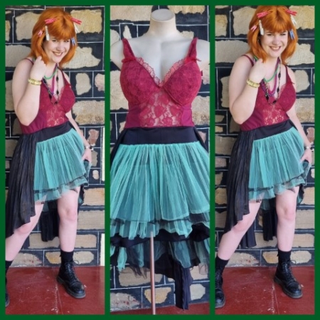 1980’s Strapless Evening Dress, Teal satin/black lace, by ‘Aurelie’, size 10