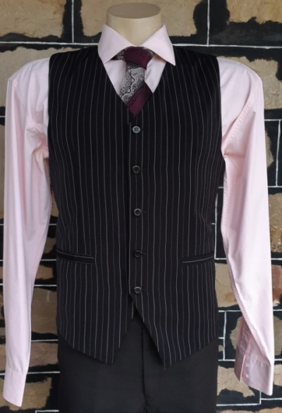 Waistcoat, Black Pinstriped, polyester, by ‘Queensland Costume Supplies’ size M-L