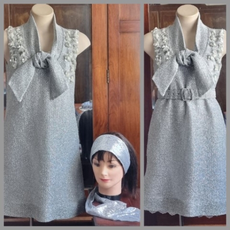 1970’s Disco Dress & Headband, Silver Sequined, Polyester, by ‘Jessica McClintock USA’, size 8