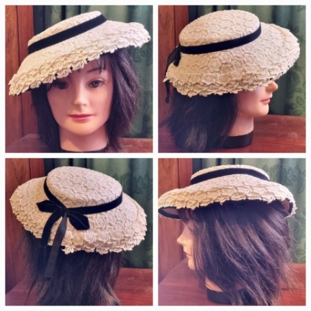 Vintage Victorian Sunhat, Cream/black, broderie anglaise, Reproduction, by ‘Play Topper of New York’