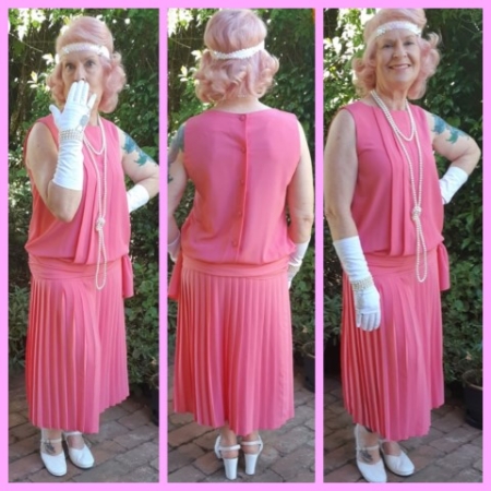 1920’s Inspired, 1980’s dress, by ‘Masquerade Sydney’ coral, polyester, with gloves & headband, size 12