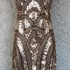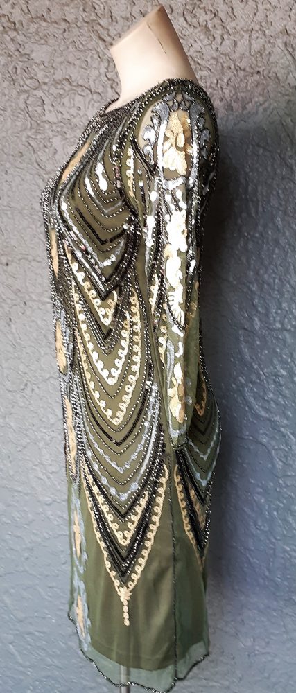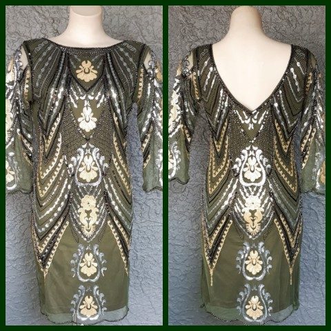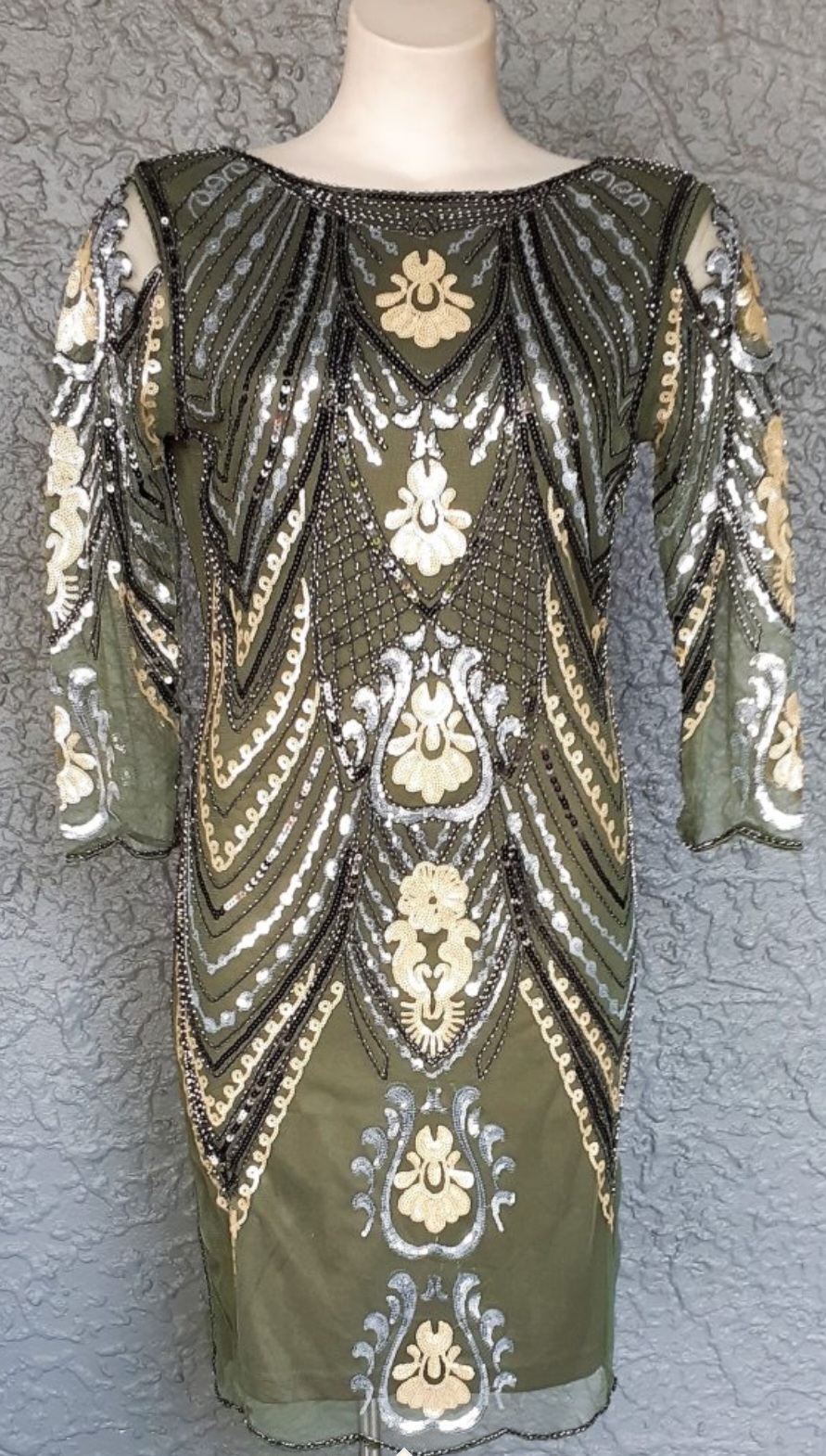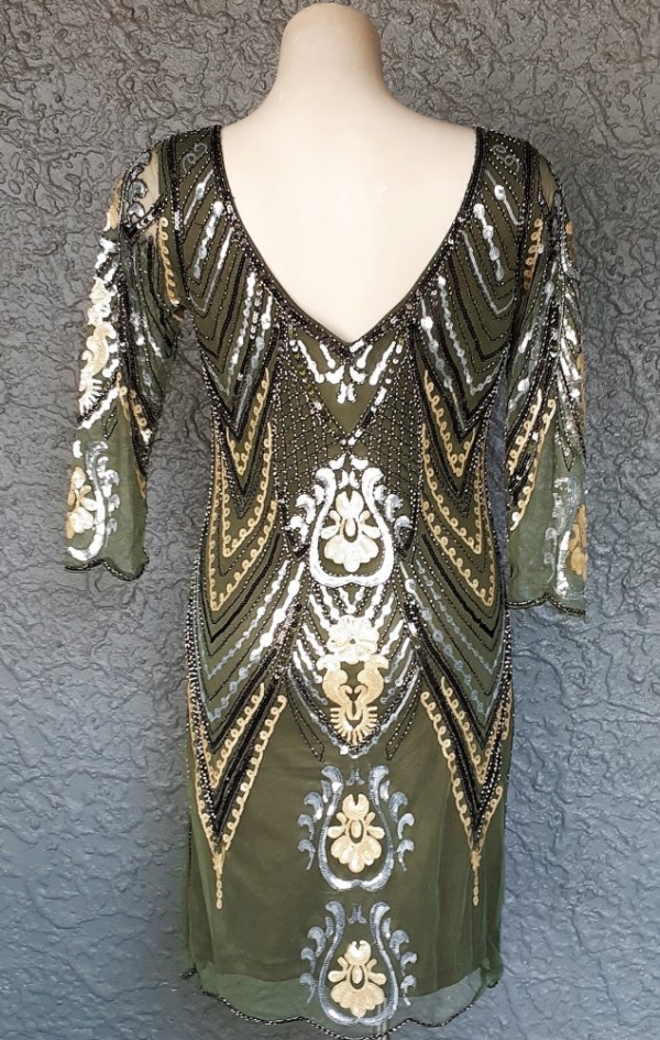 Features all over beading and sequins, scooped back and 3/4 sleeves.