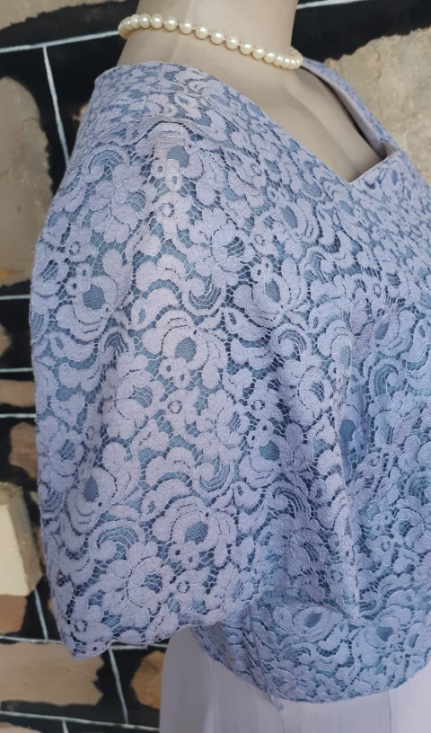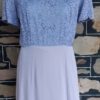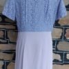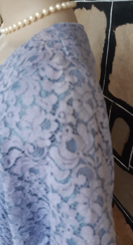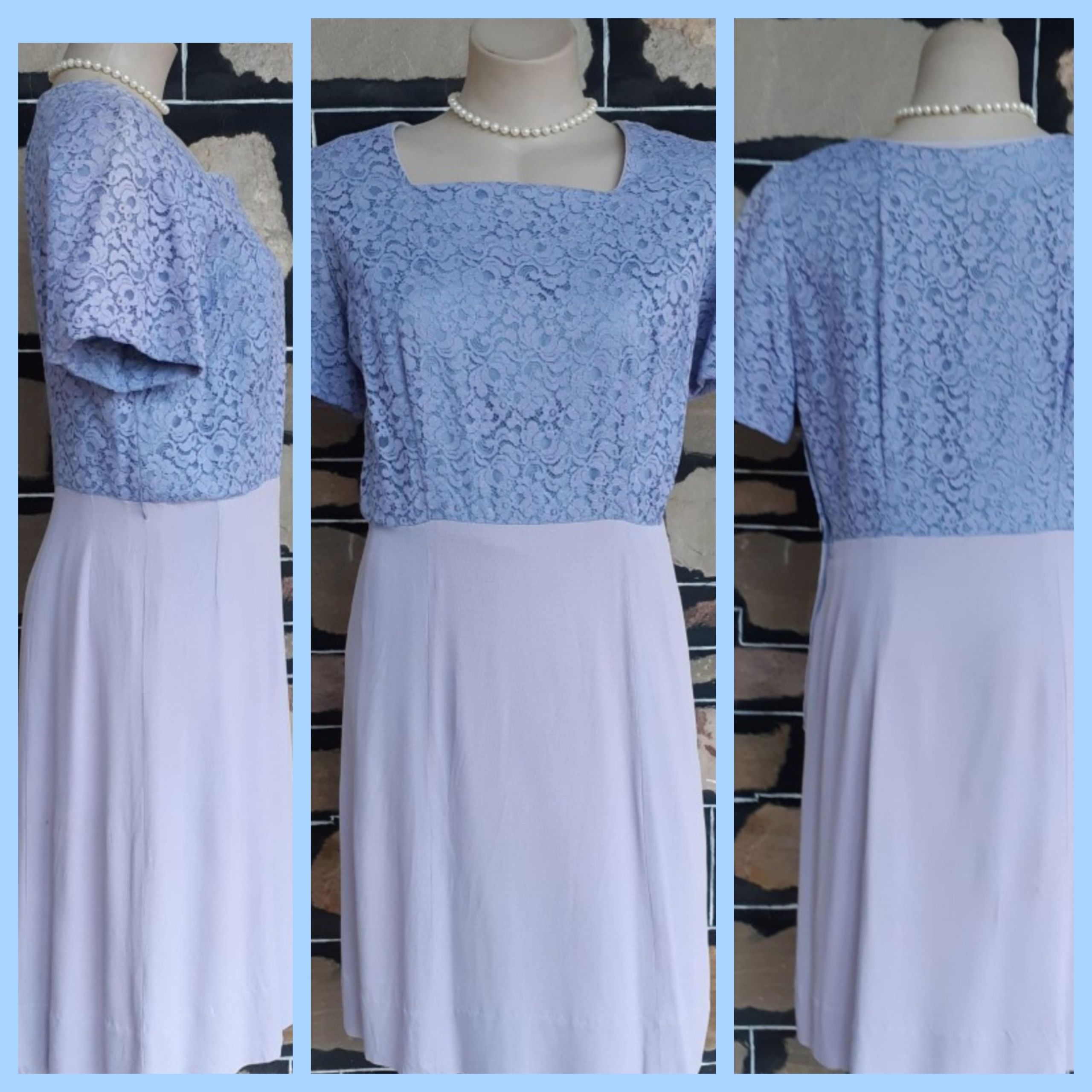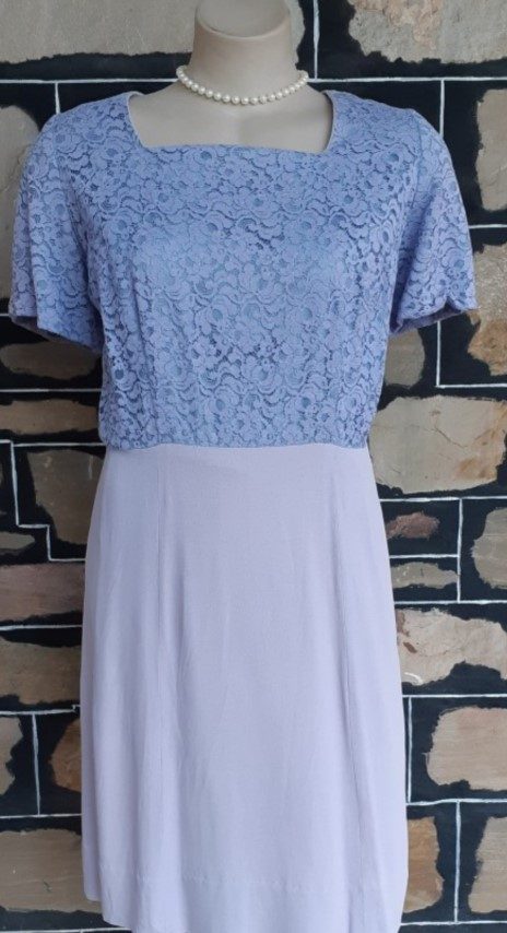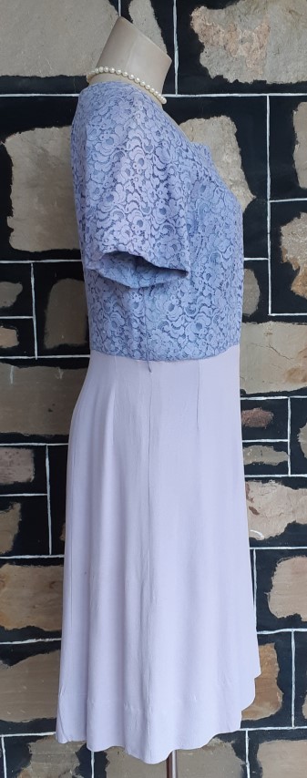 1940’s, Crepe Day Dress, lavender, lace bodice, handmade, size 12- 14. It does measure, according to our general size chart, to be a size 16, however, we are allowing for shrinkage. That being said, we have just freshly washed her, so the initial shrinkage that occurs with crepe when you first wash it has already occurred with us. To keep the dress in perfect condition from now on though, we recommend dry cleaning.