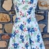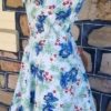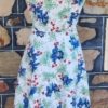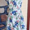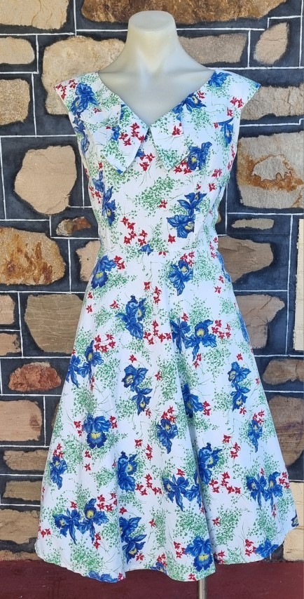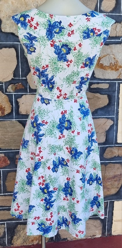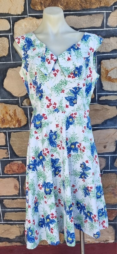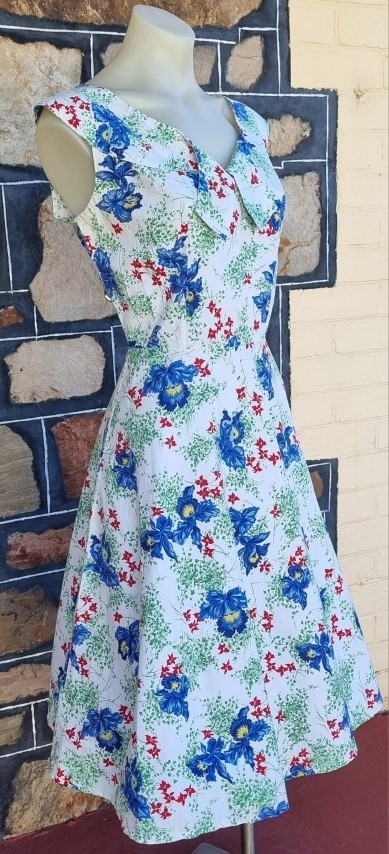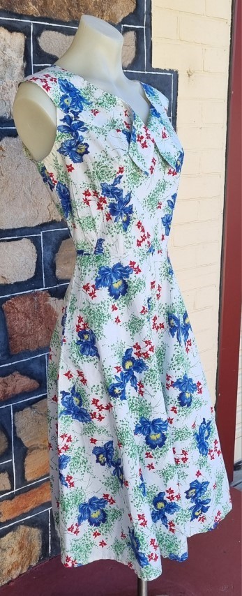 I have sized this delightful frock as a size 10 because in a flat lay, the waist is 70cm, but the bust is 100cm, something that was typical in this era, the bust was a little fuller in the cut. The length is 103cm.