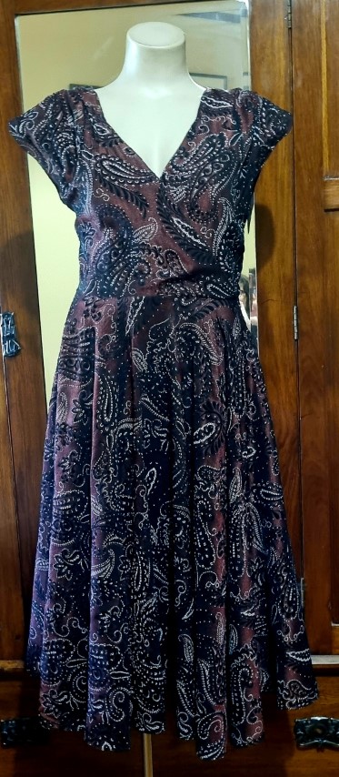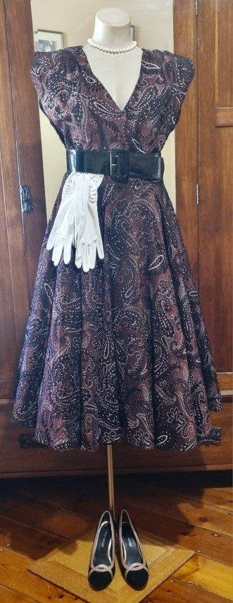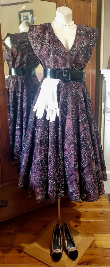 Stunning, exquisite, romantic, elegant, original 1940’s swing dress. with the fullest skirt, so fun to dance in. In the gallery photos I have have shown just how amazing she looks when you pop on a full petticoat, belt, pearls and gloves to really achieve the 40’s vibe. Non of these items are included.