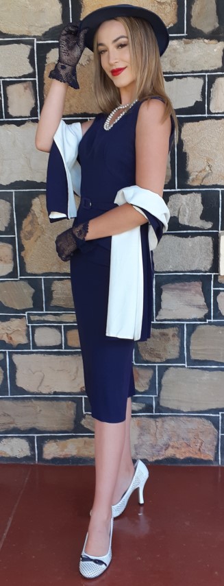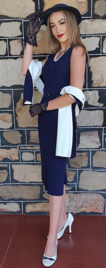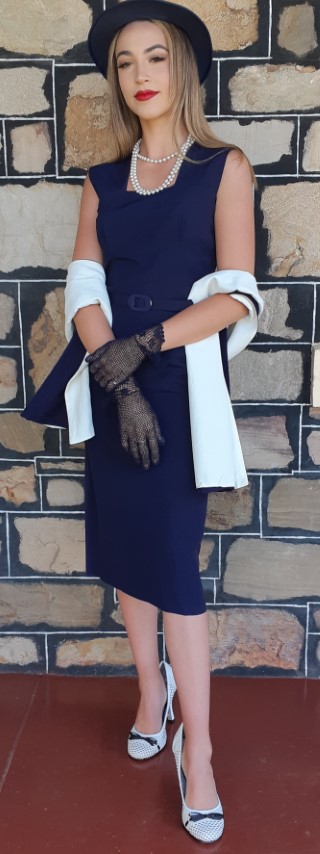 Our gallery shows our model with hat, gloves, pearls and heels which match so perfectly, but they are not included.