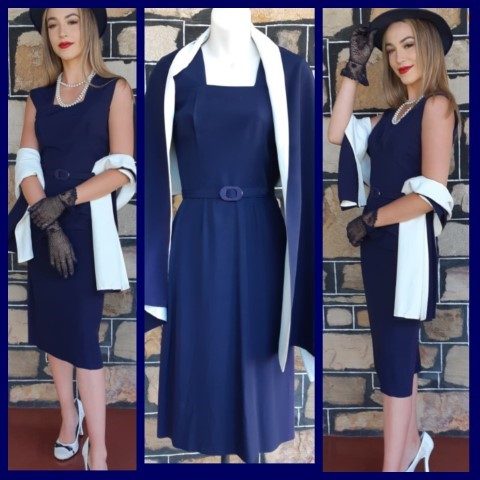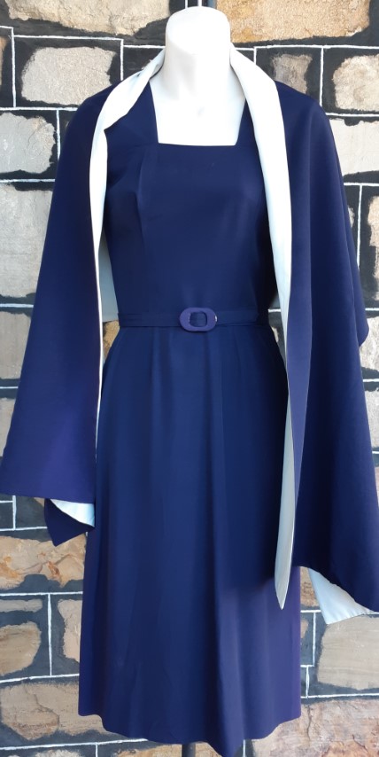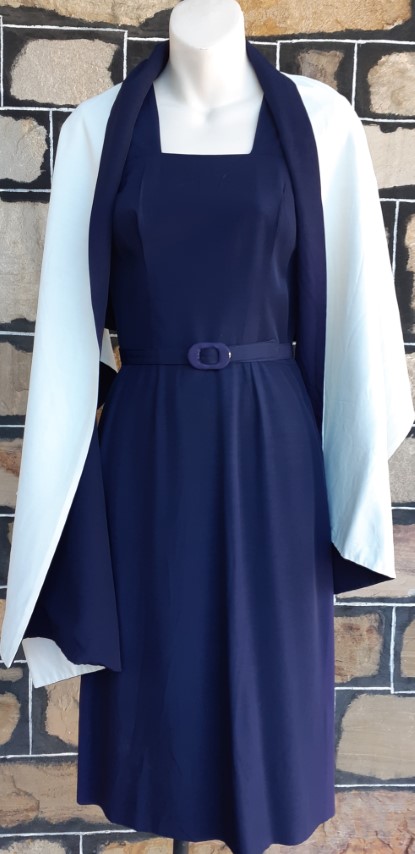 1940’s Navy sheath dress and shawl, acetate, USA imported, handmade, size 6-8