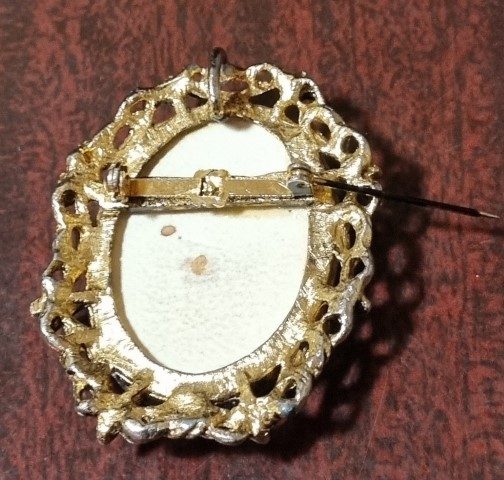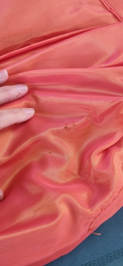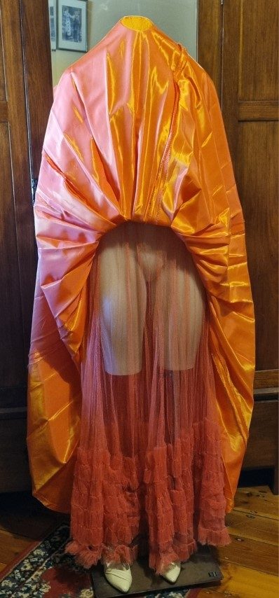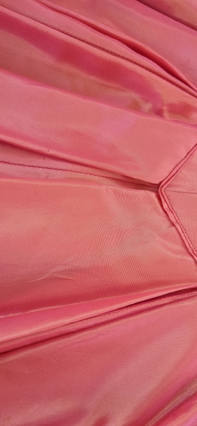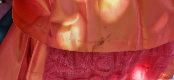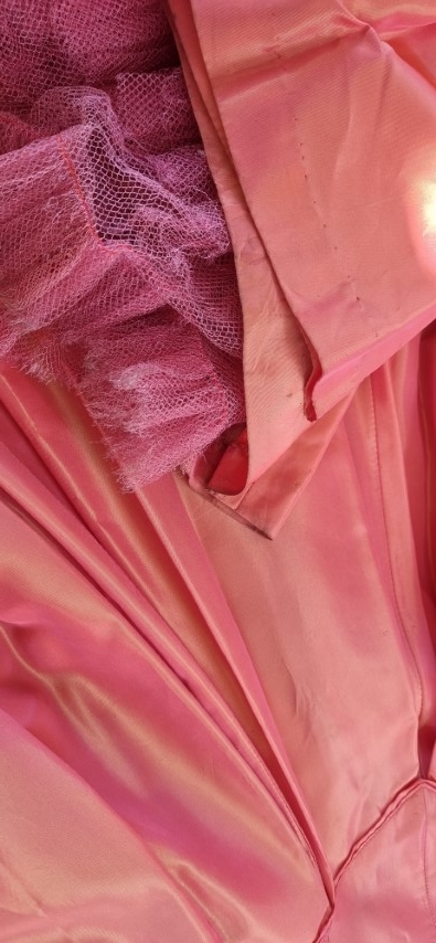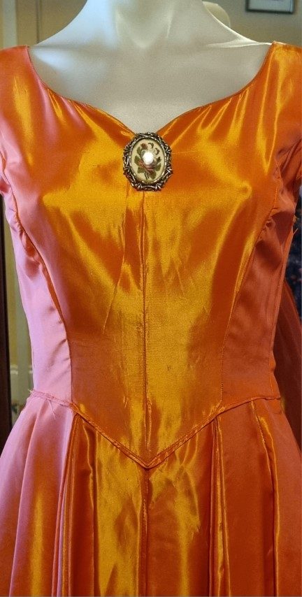 Included with this stunning Gown is a Vintage broach. I did this because, at the front of the neckline, there is a small stain and a couple of minuscule holes. This adorable broach adds an air of romanticism whilst hiding the flaw. There are a few more tiny holes, hardly noticeable in the gorgeous full skirt, most have been mended. And, although it has been laundered, there were a few stubborn stains, but again, hard to see, except the ones on the bottom of the hem, it was obviously too long for the original owner! The pin holes, there are pictures in the gallery, that must have had something attached to it at some stage, again, they are very hard to notice.