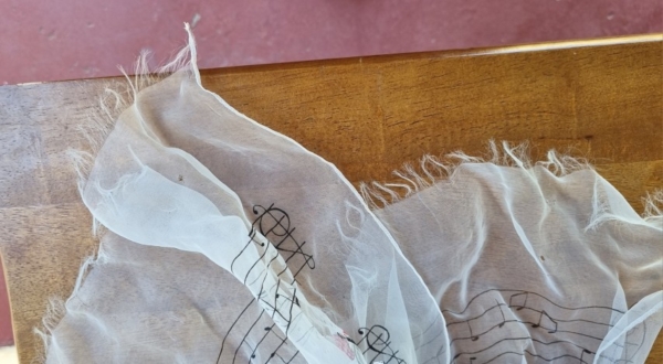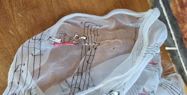 Oh so so so adorable! It is delicate and quite unique with a print of swing dancers and musical scores, just gorgeous. There are a few runs here and there, the photos are at the end of the gallery, but hey, its around 80 Years old!