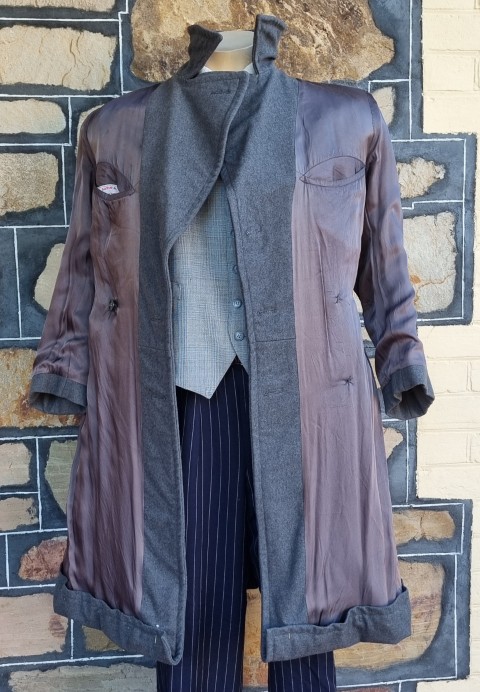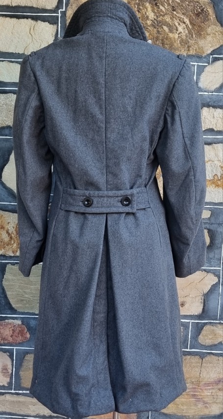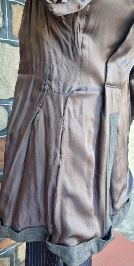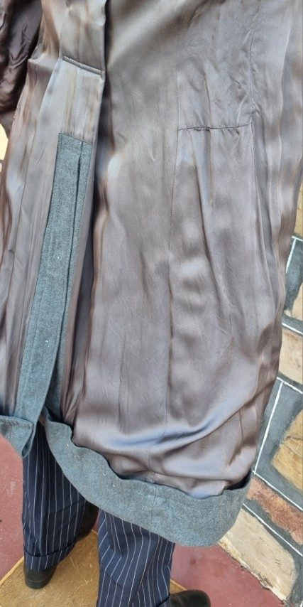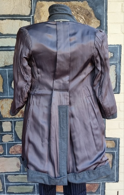 Now, I must inform you that it needs the hem to be either turned up, I have shown this in the photos, or the hem needs to be realigned. Unfortunately, the lovely family that I have excepted it from, to sell on consignment, washed the coat, instead of Dry cleaning it, so the outer wool has shrunk and is causing the hem to be rumpled. So, it is a project. For this reason and have heavily reduced the price, to compensate. I mended the lining in a few places and re-sewed new buttons on the belt at the back because 2 of the brass ones were missing on the front, so I swapped them over.