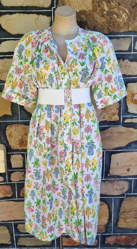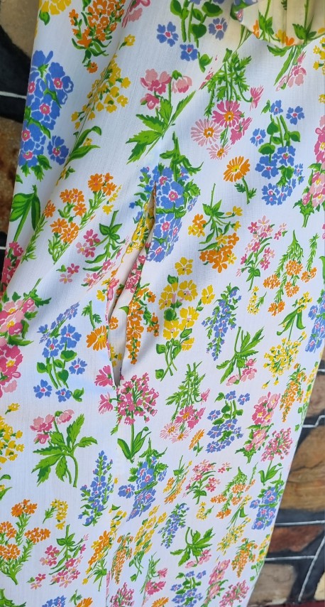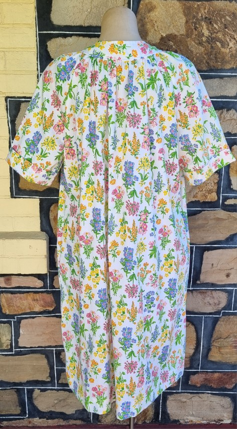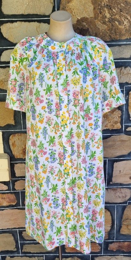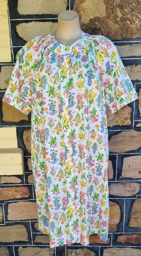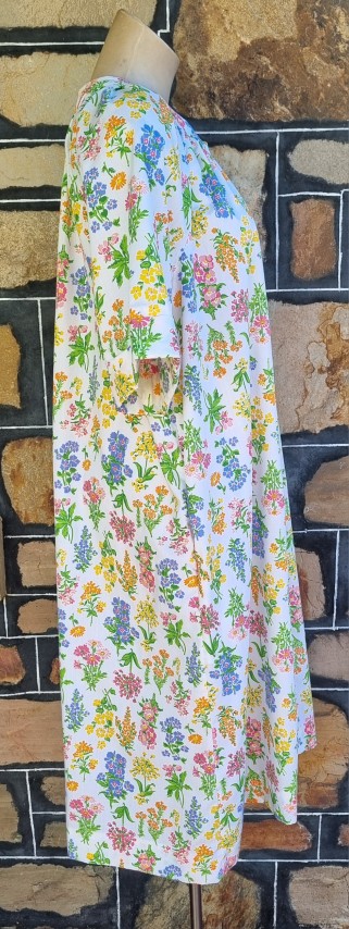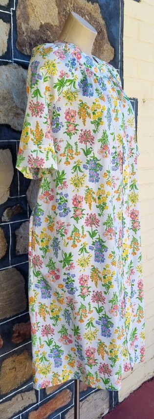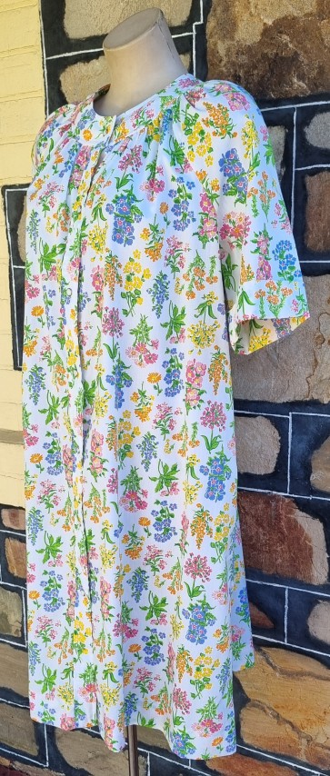 In the 50’s, ladies were great homemakers, but they always wanted to, or needed to (very sexist) present themselves as perfect. In the sense that she was expected to be flawless in her appearance. With that said, along came the invention of the ‘House Coat’, worn over their regular clothing, to keep it clean, while they did the household chores, just in case their husband came home early, or neighbours dropped in. Well, here is an adorable one, freshly laundered, in excellent condition and oh so pretty. It has 2 front pockets and all the press studs are present and working.