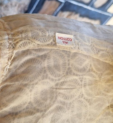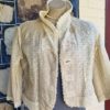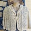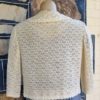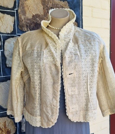 It is a cute cotton lace bolero jacket, freshly laundered and in excellent condition. The top covered button was missing, but I have replaced it with an equally lovely one. It is fully lined. She has 3/4 length bell sleeves too.