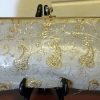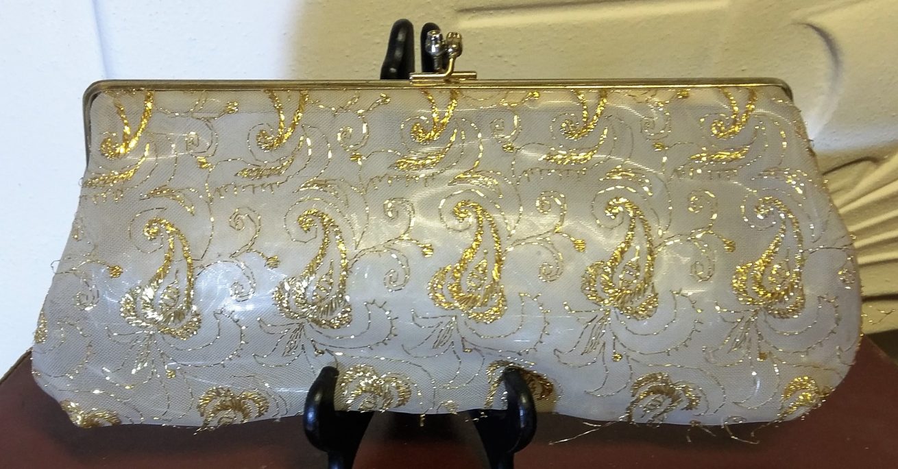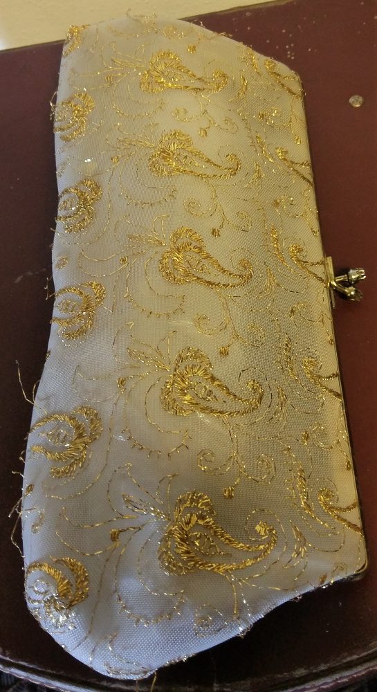 1950’s, Clutch bag, gold thread encrusted on mesh plastic