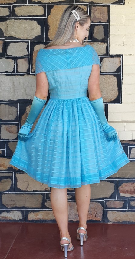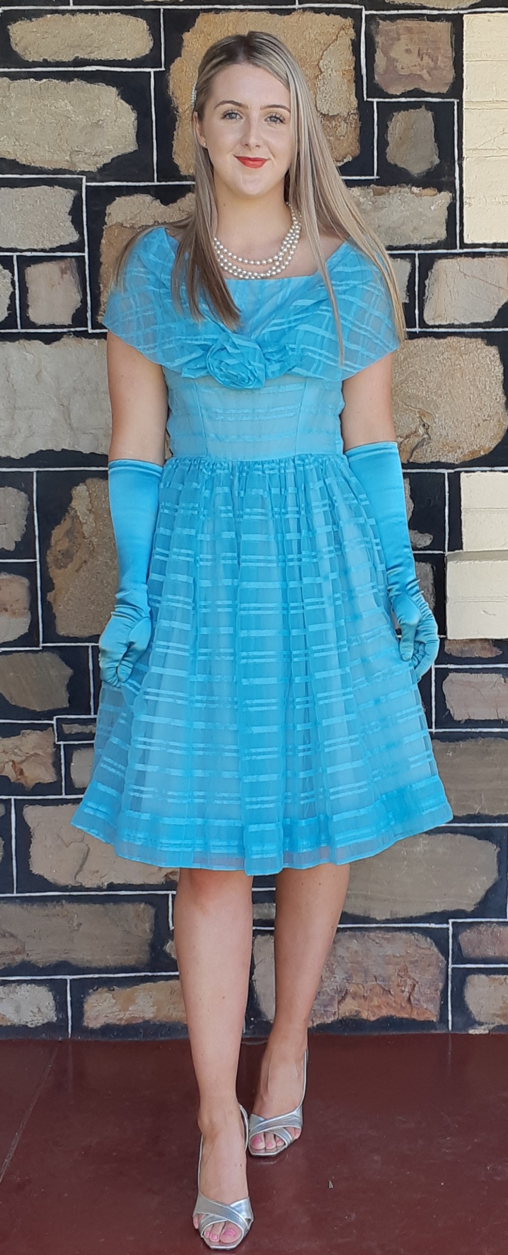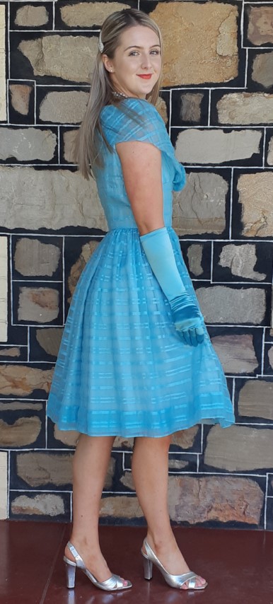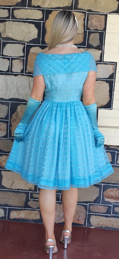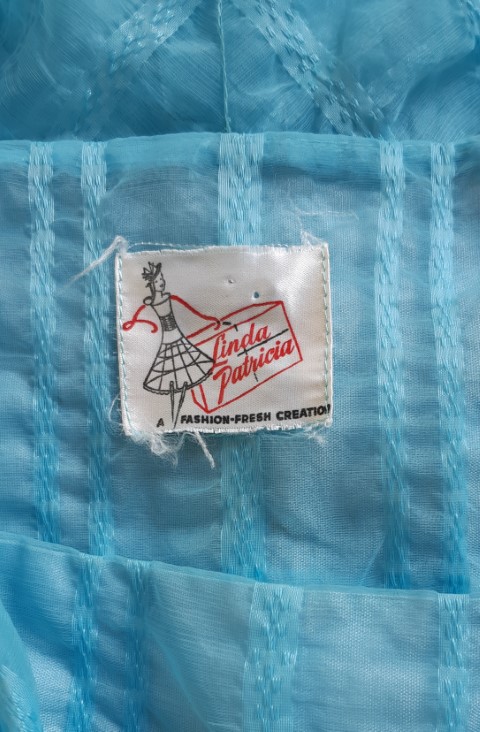 1950’s Party Dress , blue, Nylon/satin by ‘Linda Patrica’, imported from and made in USA.