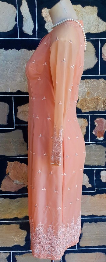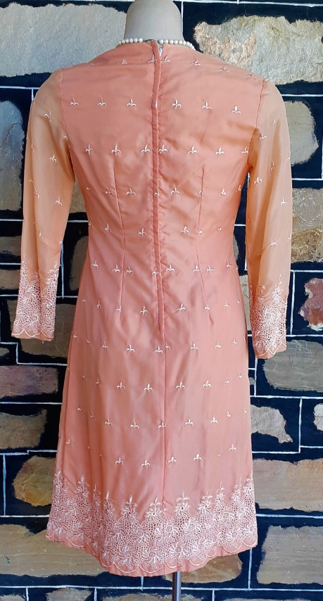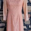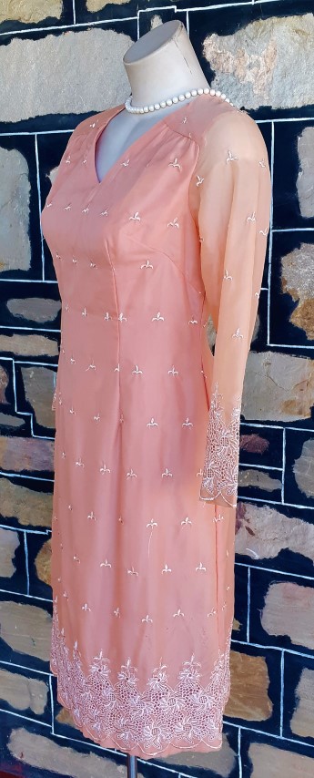 1960’s, 3/4 sleeve Shift dress, Nylon, Peach, handmade in and imported from USA, size 10