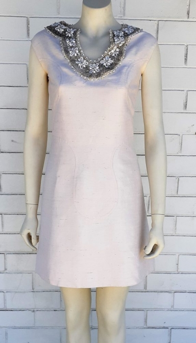 Freshly laundered, fully lined with satin polyester and working metal zip. The feature on the neckline is repeated at the splits on the sides of the dress, so pretty.