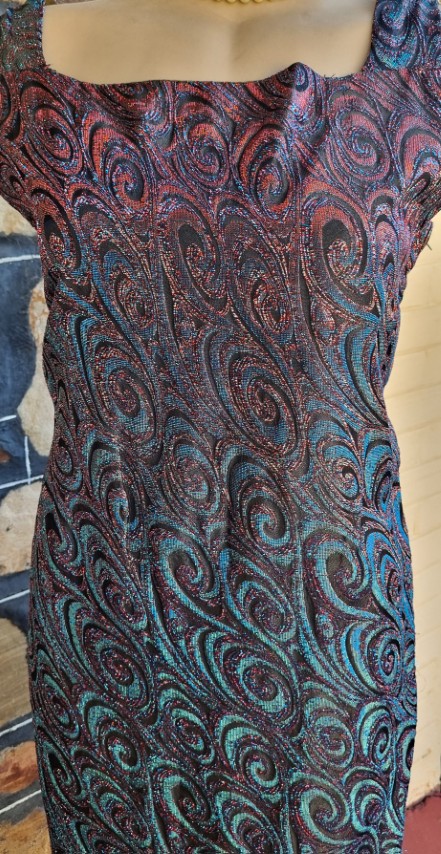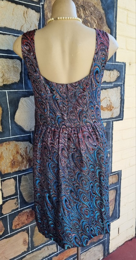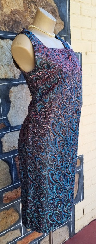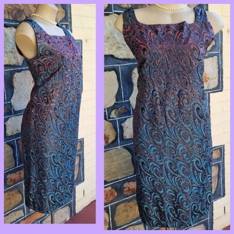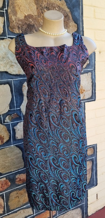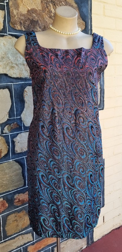 1960’s, Cocktail Shift Dress, Metallic Lurex, handmade, blue/violet, size M.