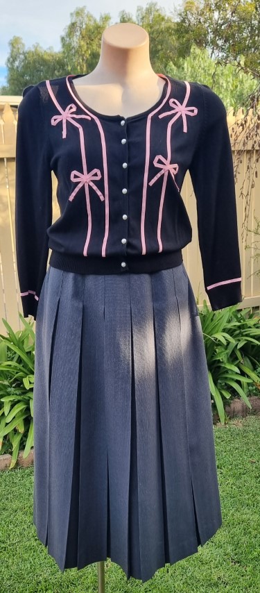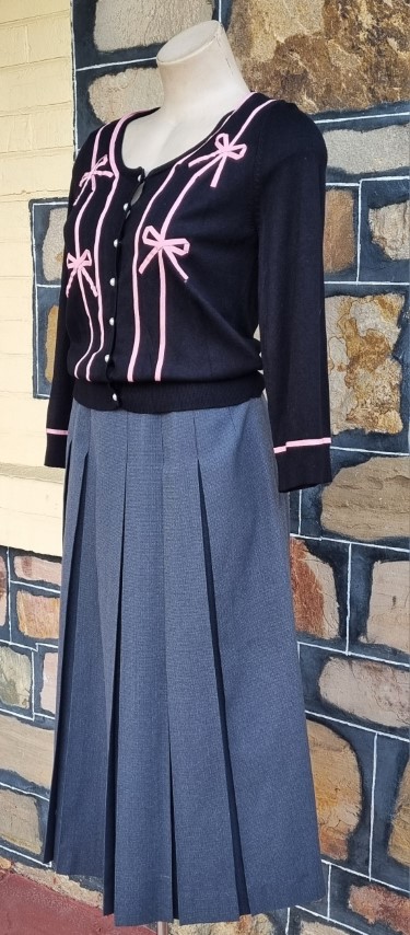 How cute is this cardigan! She has a real secretary, collage vibe, especially when teamed with our box pleat wool 60’s skirt for a fun example.