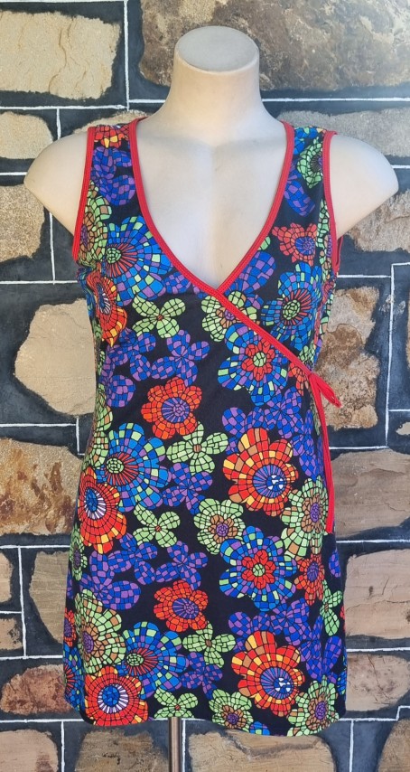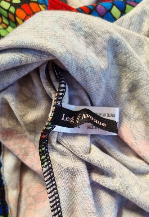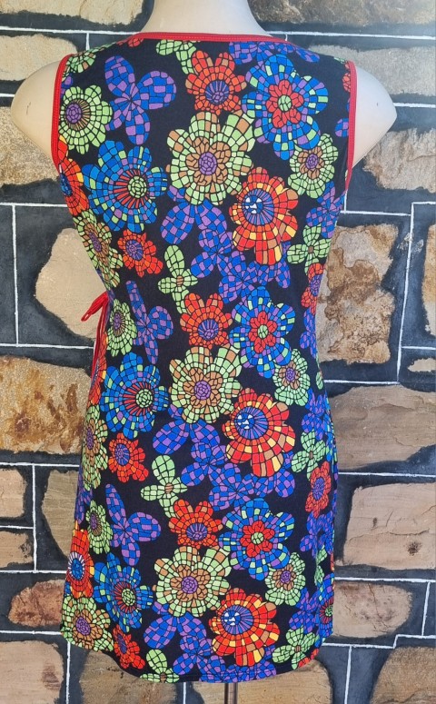 The fabric is comfortable and stretchy, the print is happy and colourful. No Zip, just slip her on. freshly laundered and in excellent condition.