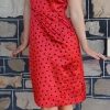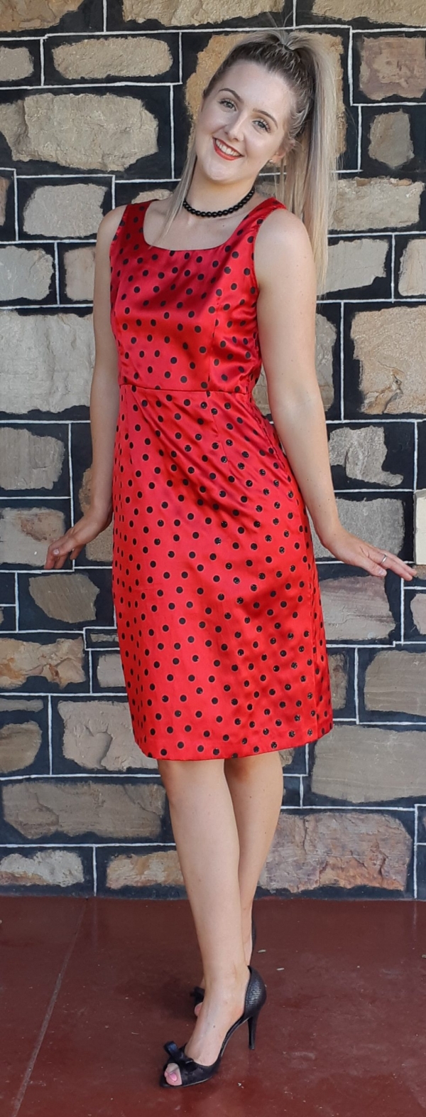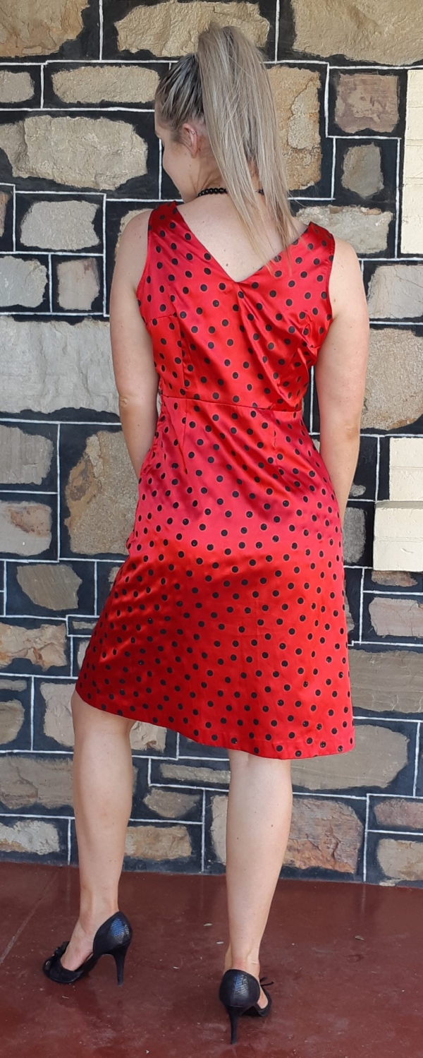 1960’s inspired Red/ black Polka-dot, satin polyester wiggle dress.