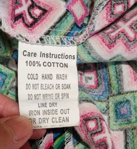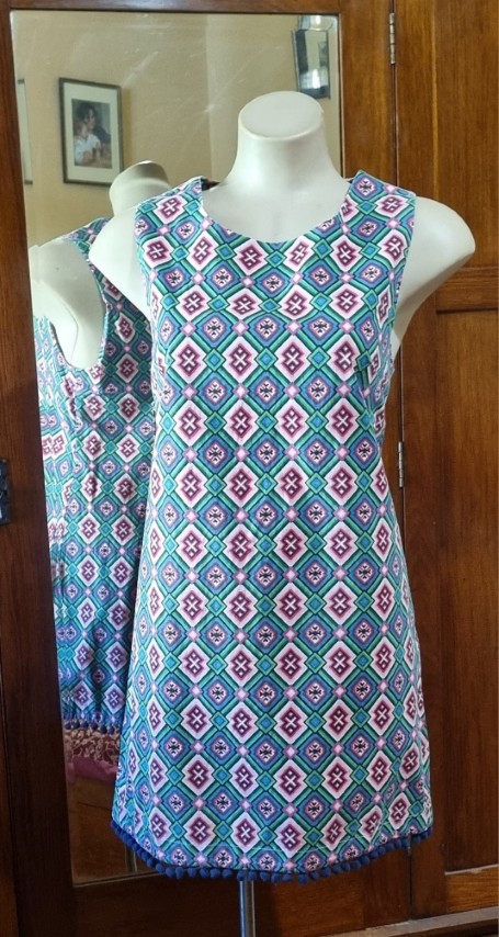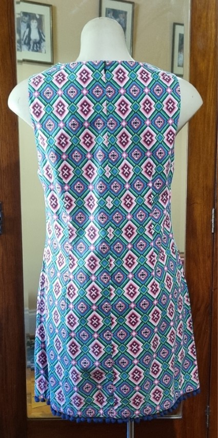 What a vibrant, fun print! The cute bauble trim, just adds to her appeal.