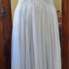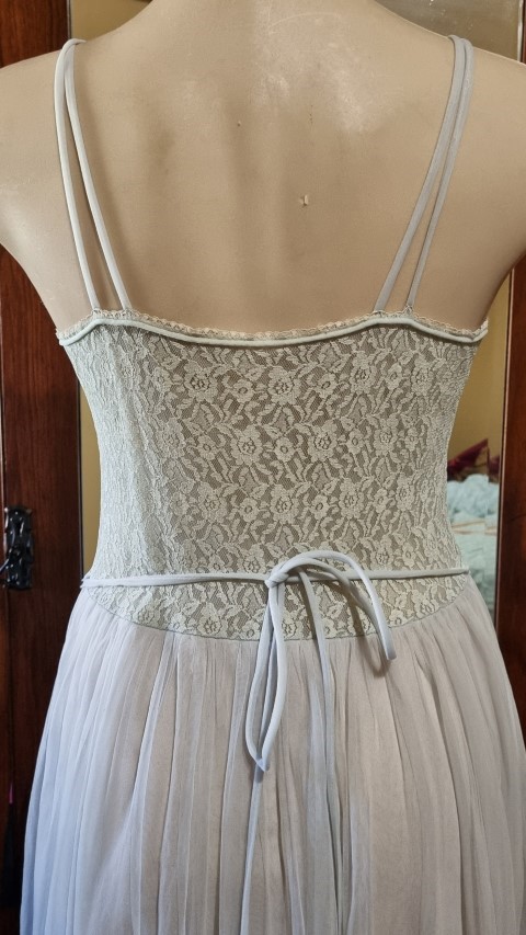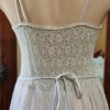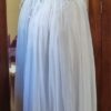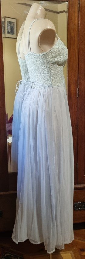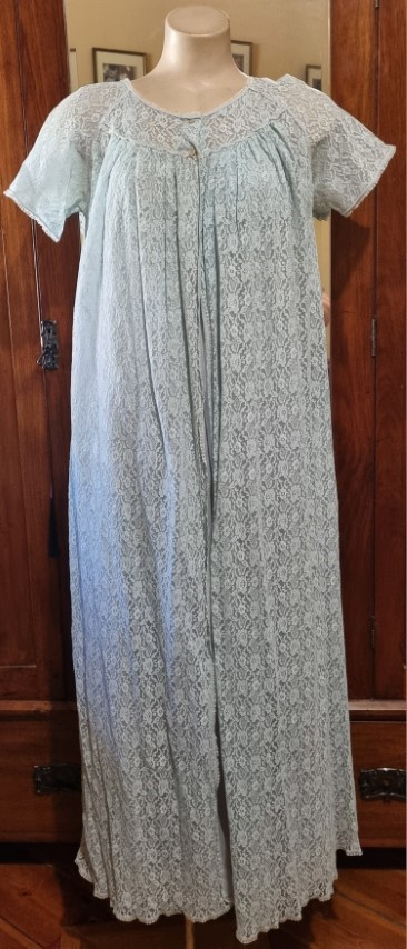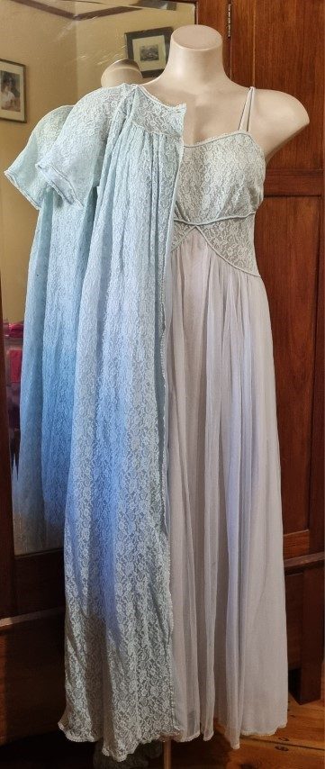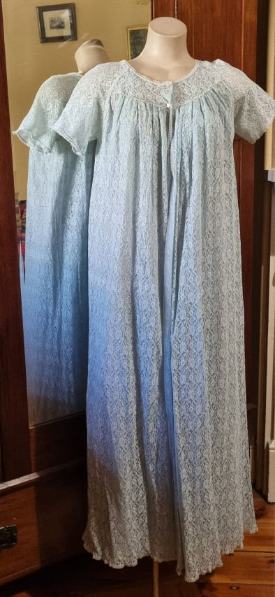 Freshly laundered, the dressing gown is in excellent condition and has 2 layers, one lace, one nylon. The shoulder span is 38cm and the length is 137cm.