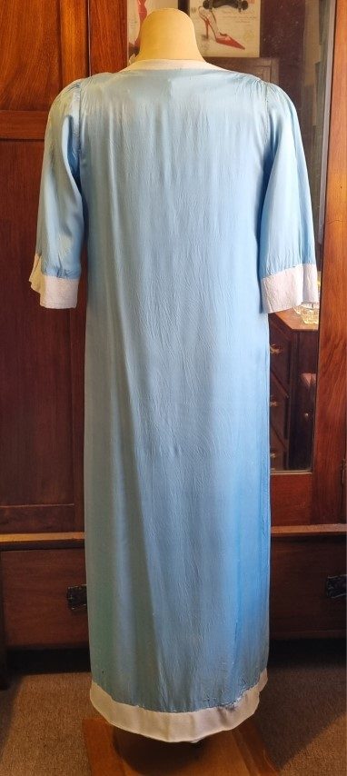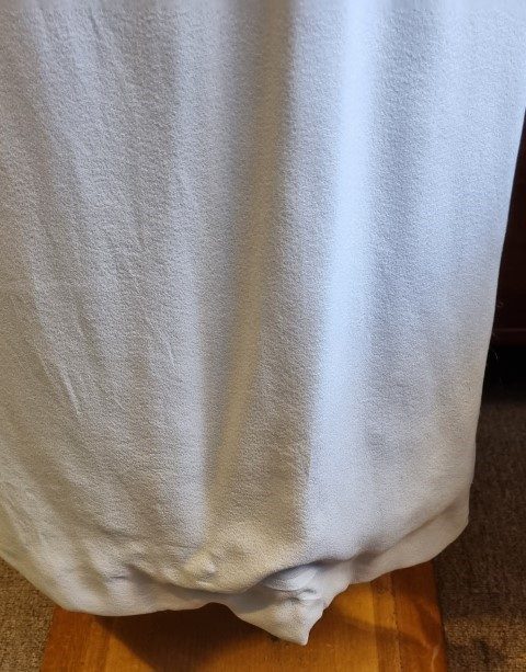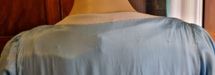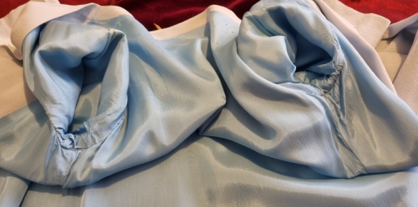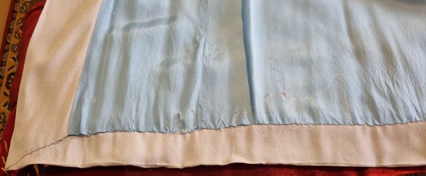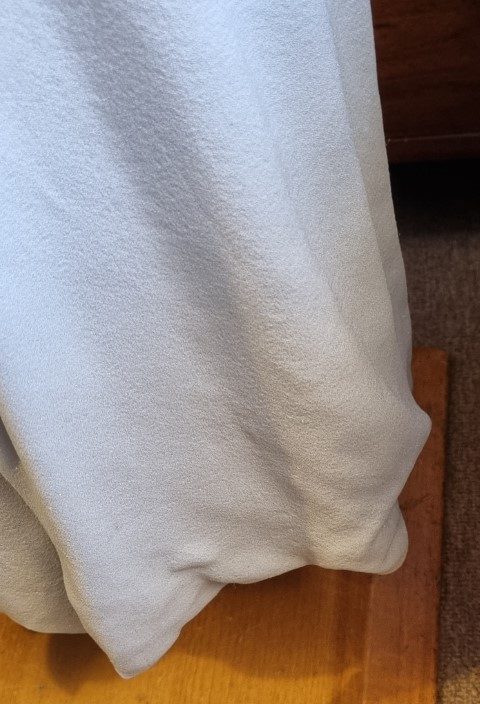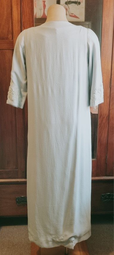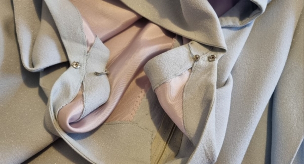 Being crepe, it is renowned for shrinking when first washed, and that is just what happened when I did it, well only in the jacket, the outer crepe shrunk, it will be advised to dry clean from now on. So, for this reason, and that there are a few patches in the lining with tiny holes, I have reduced the price. The jacket can be fixed, it simply needs the stitching at the hem to be re-sewn.