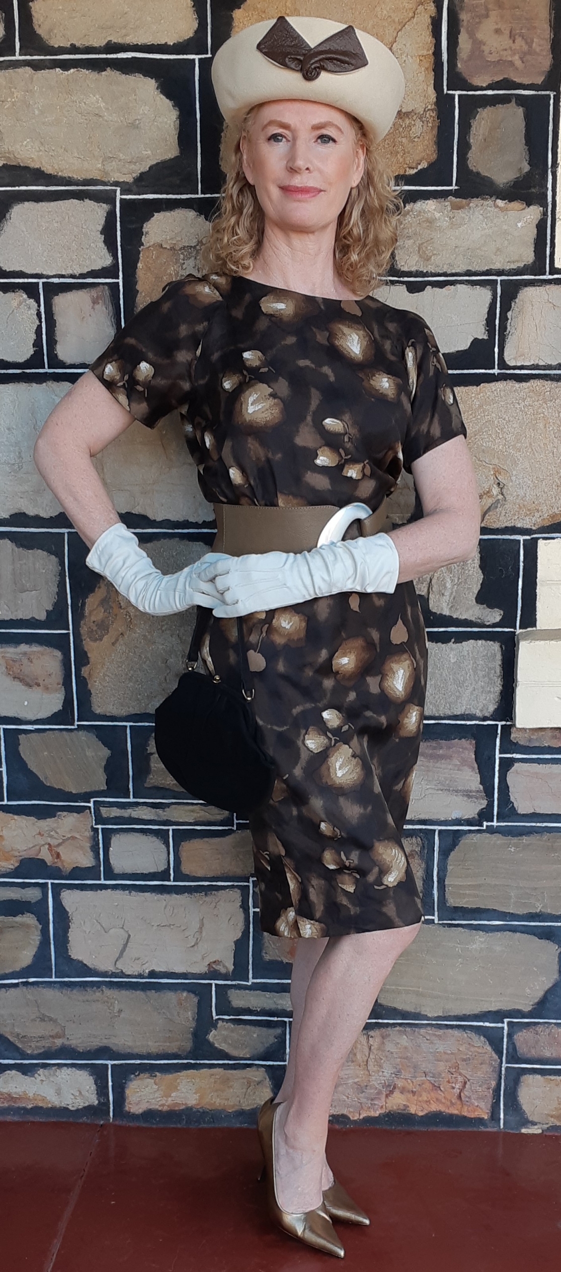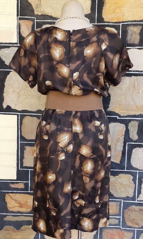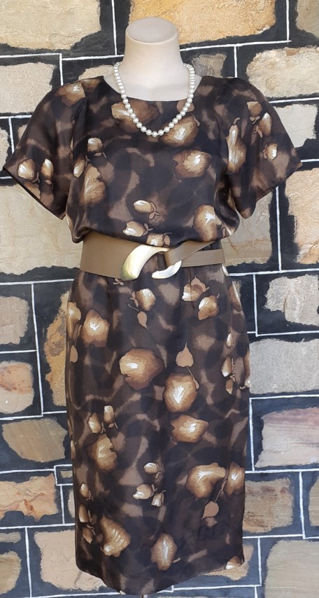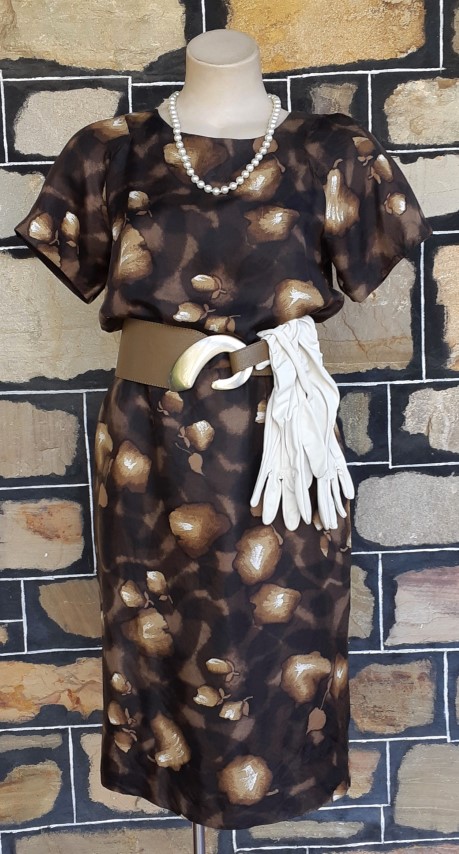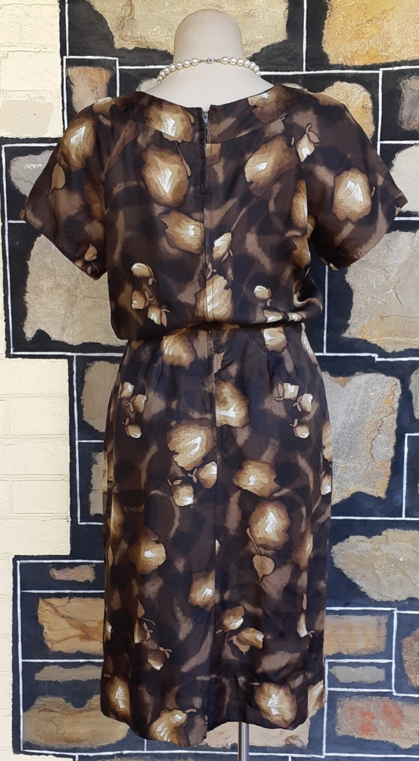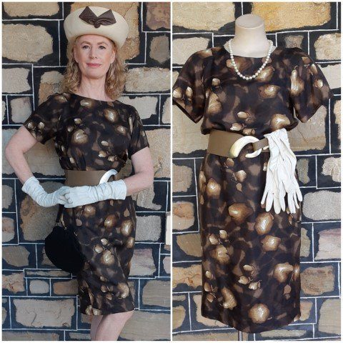 1960’s Silk Wiggle dress, handmade, brown tones leaf print includes gloves and belt.
