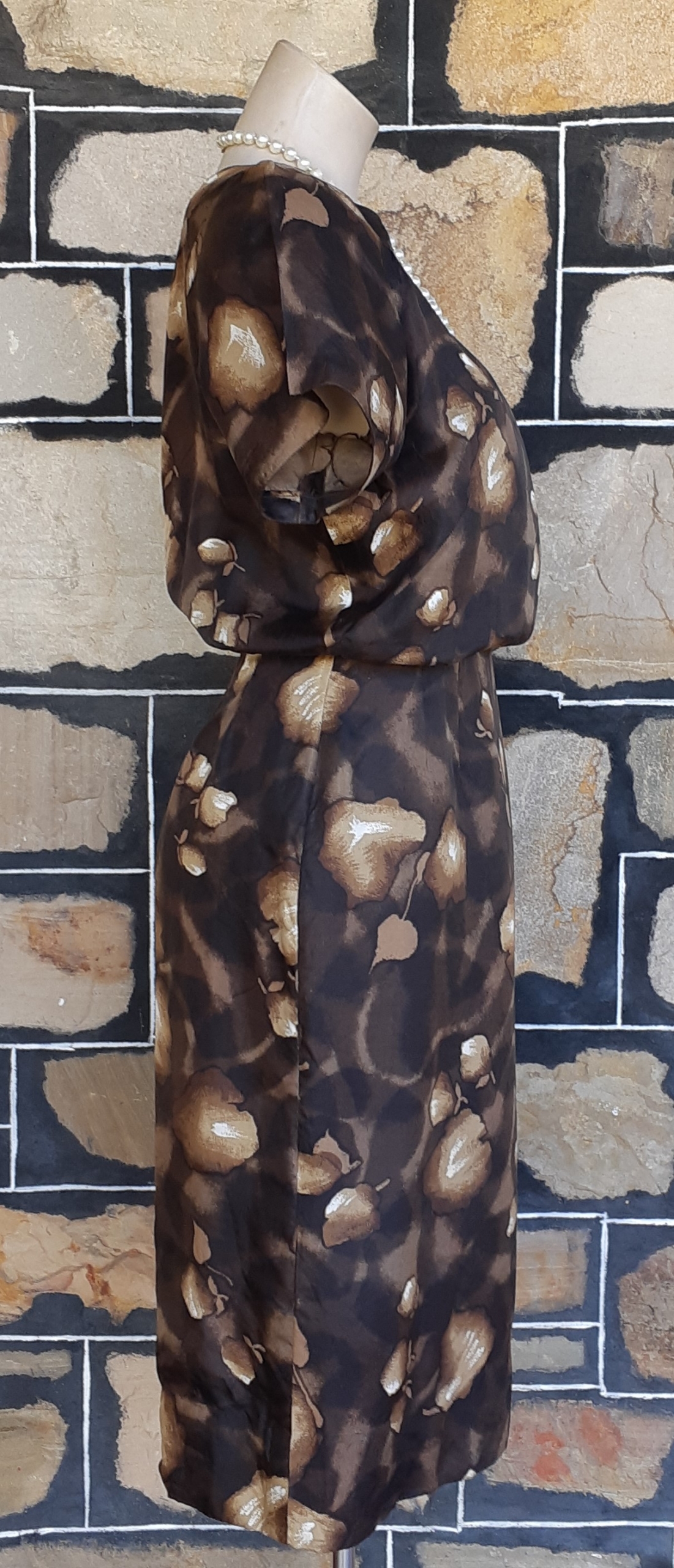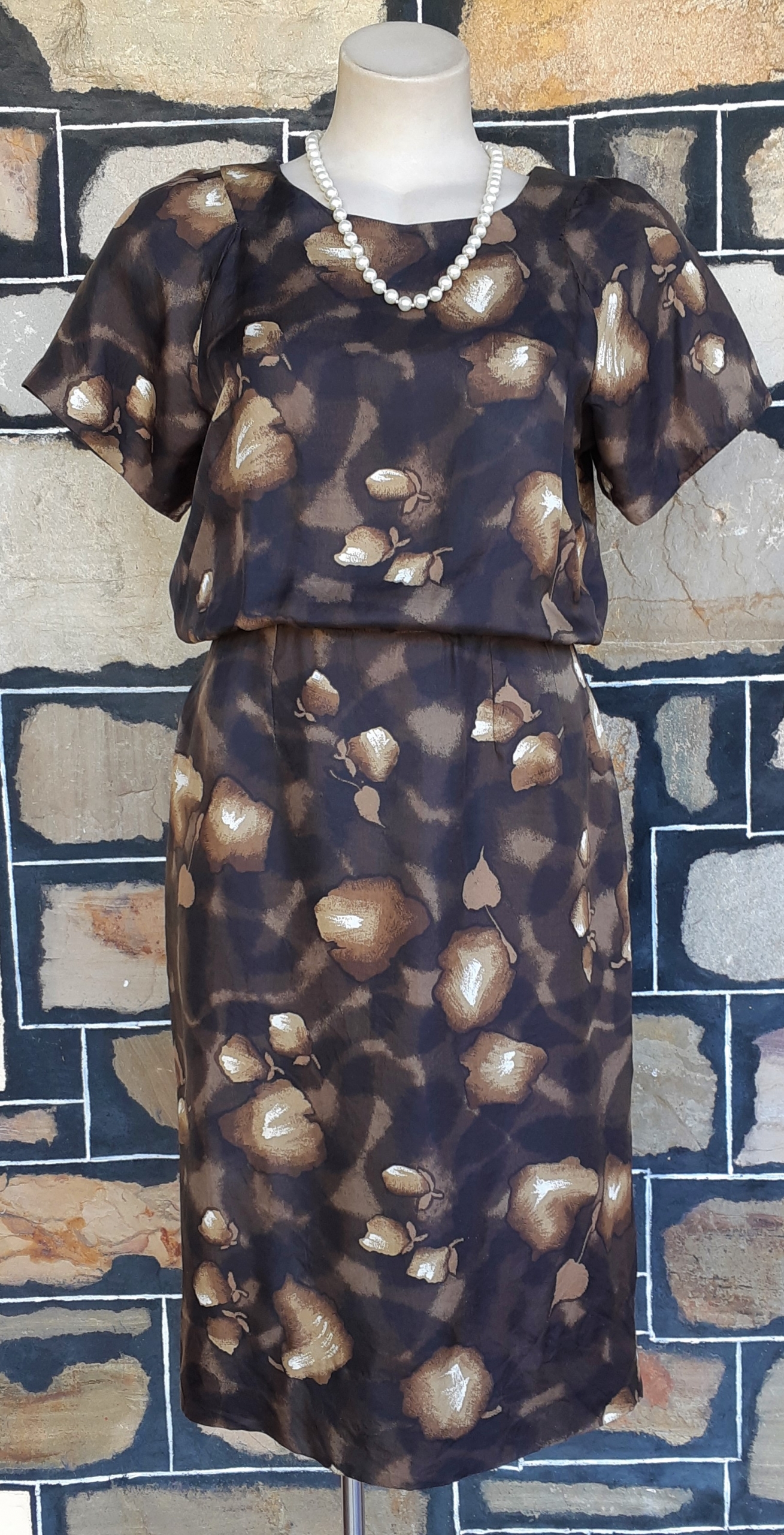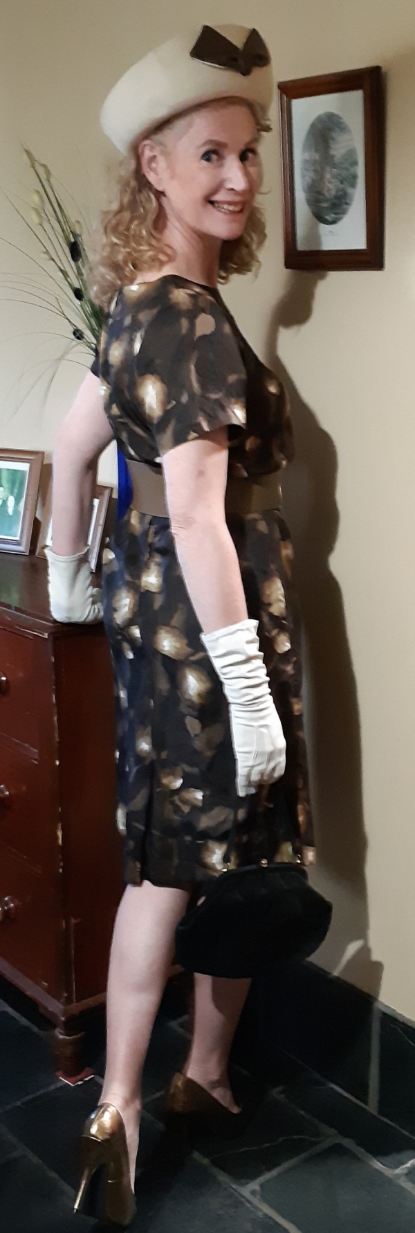 1960’s Silk Wiggle dress, handmade, brown tones leaf print includes gloves and belt.