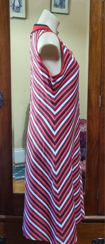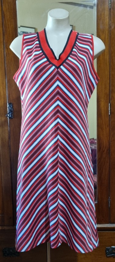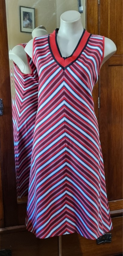 1970’s A-line Dress, Red/white Stripes, Polyester, Handmade, size 14