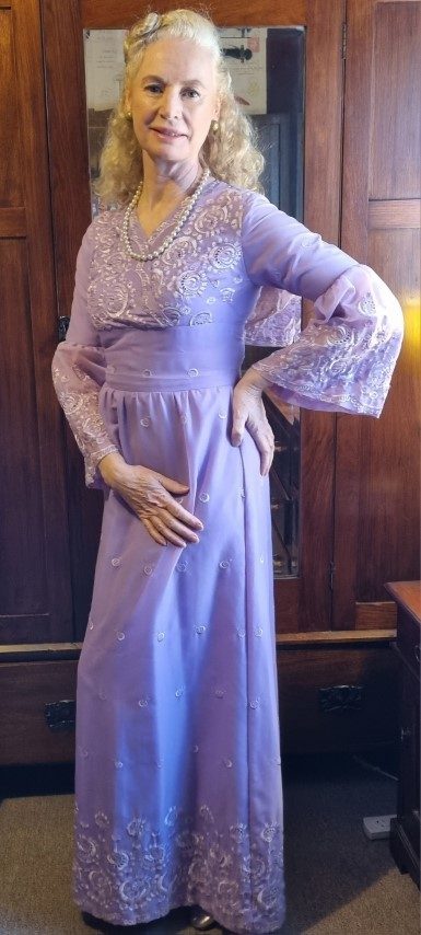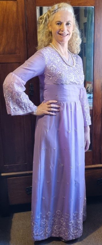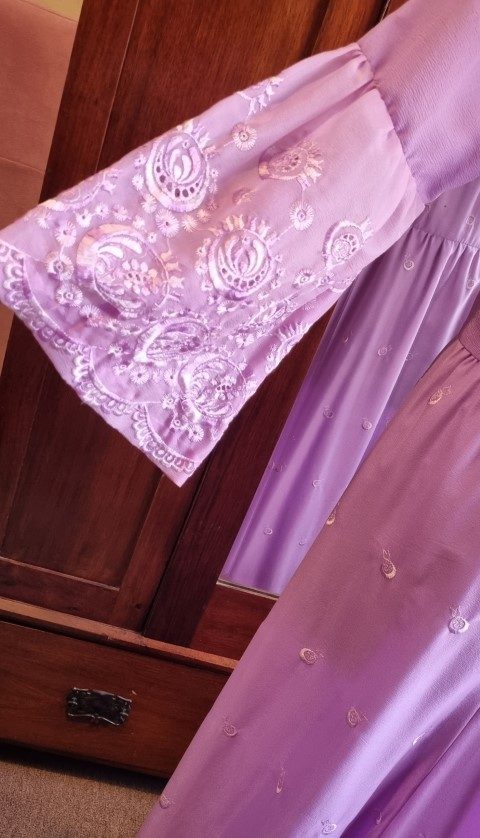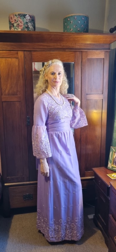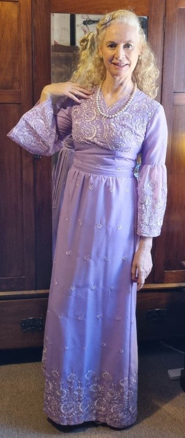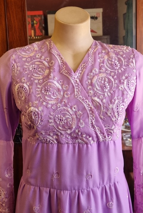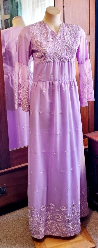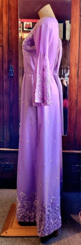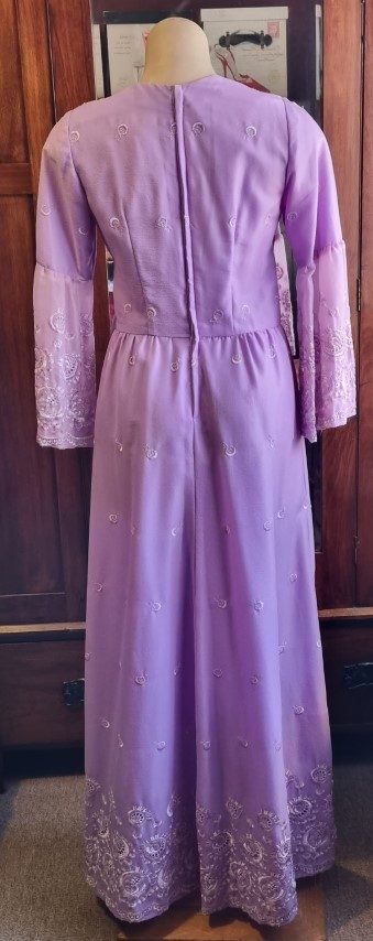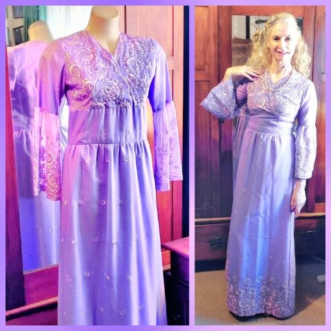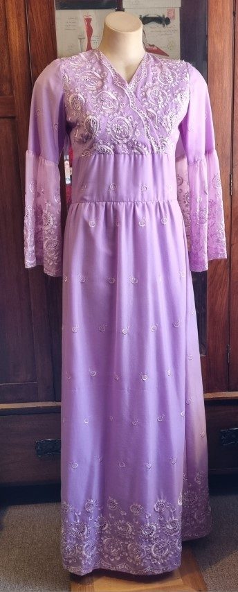 1970’s, Bell Sleeved Gown, lavender, polyester, handmade, size 10