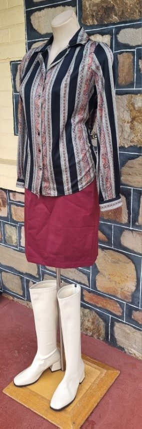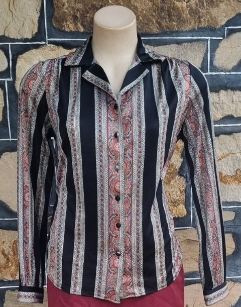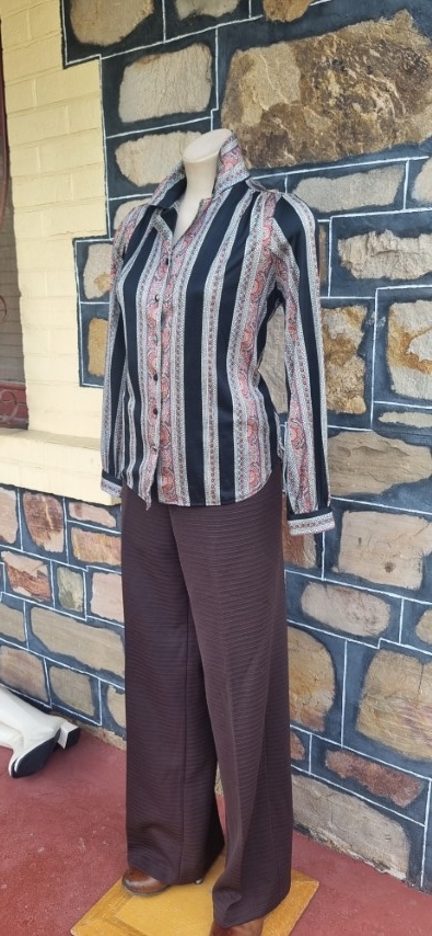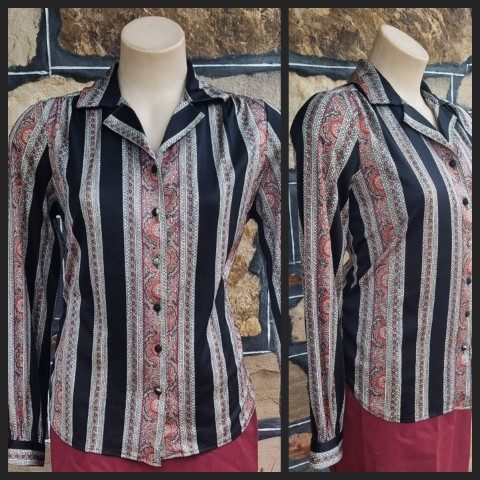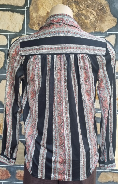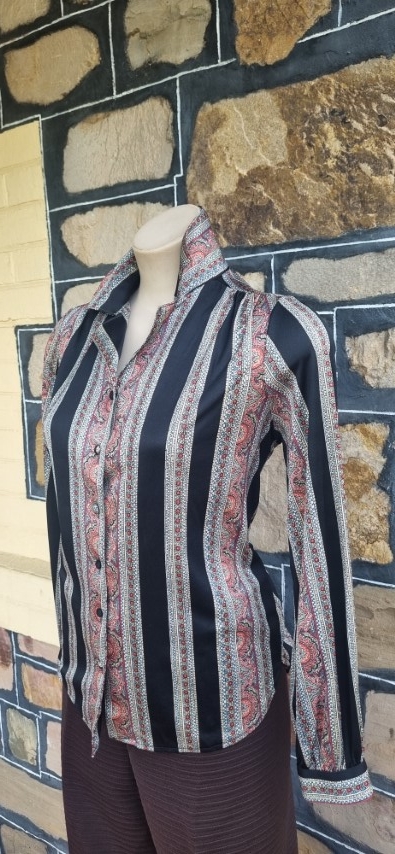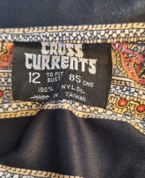 1970’s Blouse, black print, polyester, by ‘Cross Currents’, size 12