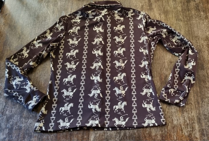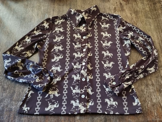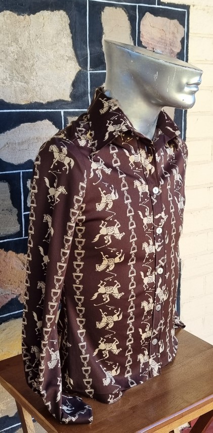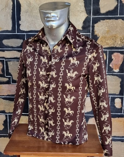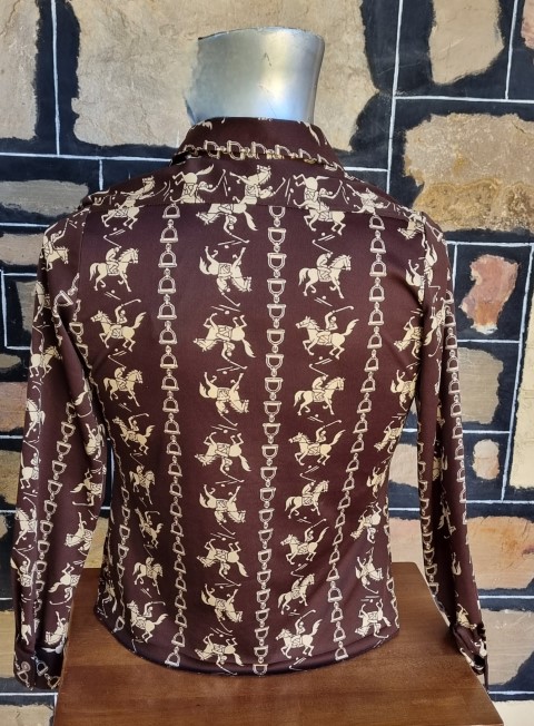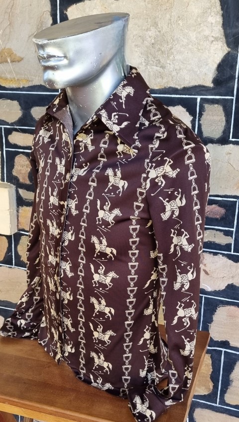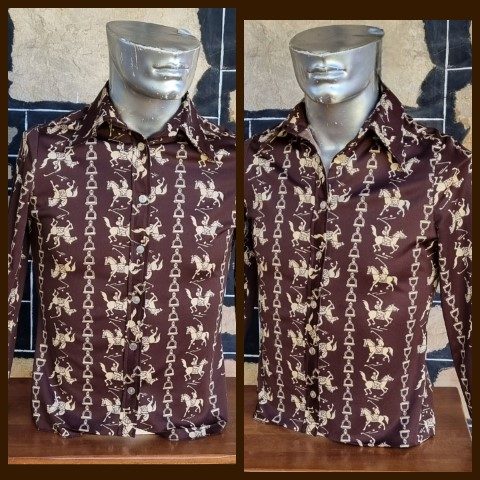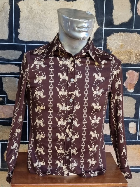 1970’s Boys Disco Shirt, brown/taupe horse print, polyester, size 10-12