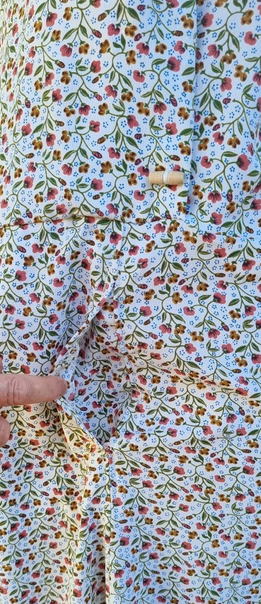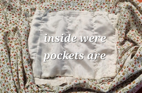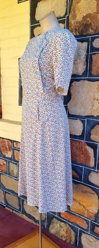 Elegantly Classy, features include toggle button trim on bust and 2 hidden front pockets in the front panel, see photo in the gallery. Freshly laundered and in excellent condition.