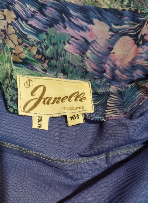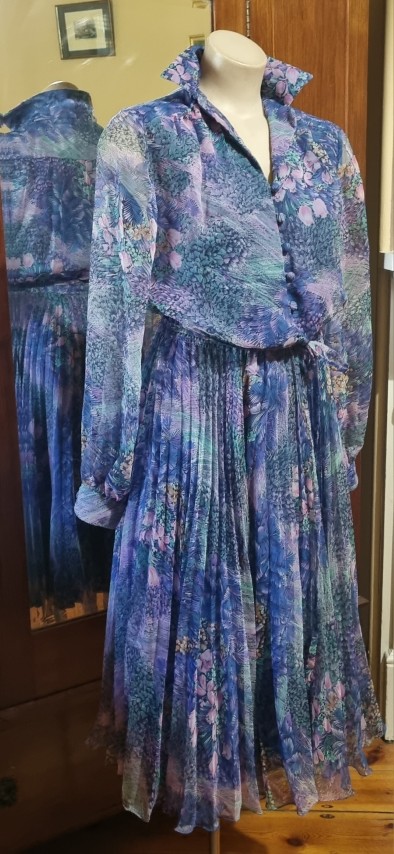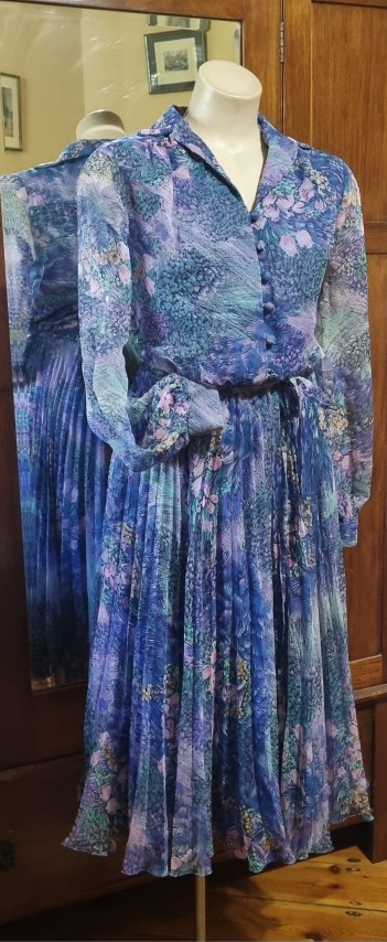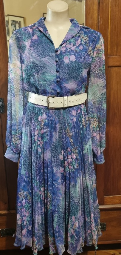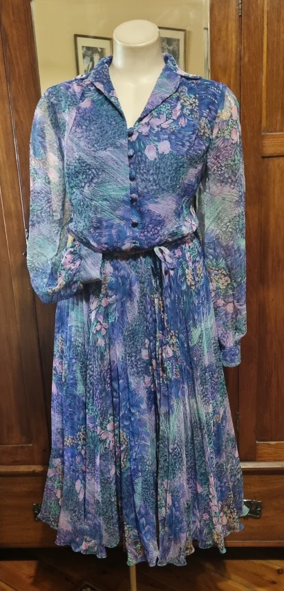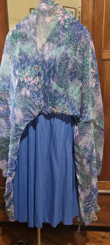 1970’s Georgette Evening dress, blue floral print, polyester, by ‘Janelle of Melbourne’, size 14
