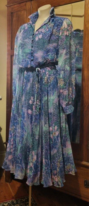 What a lovely, springtime print! The skirt is sunray pleat and full, perfect for dancing in. Peasant sleeves, and self-covered buttons are a typical feature of dresses from this late 70’s era.