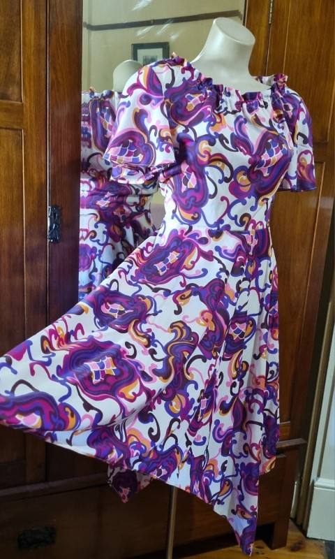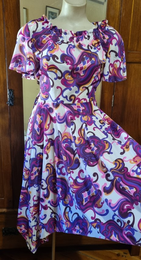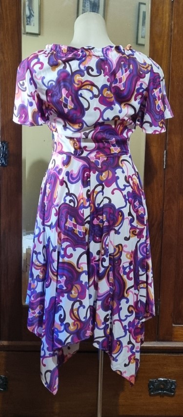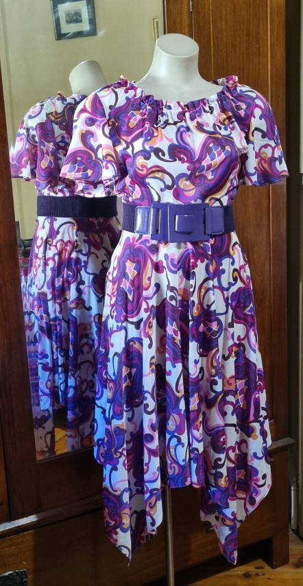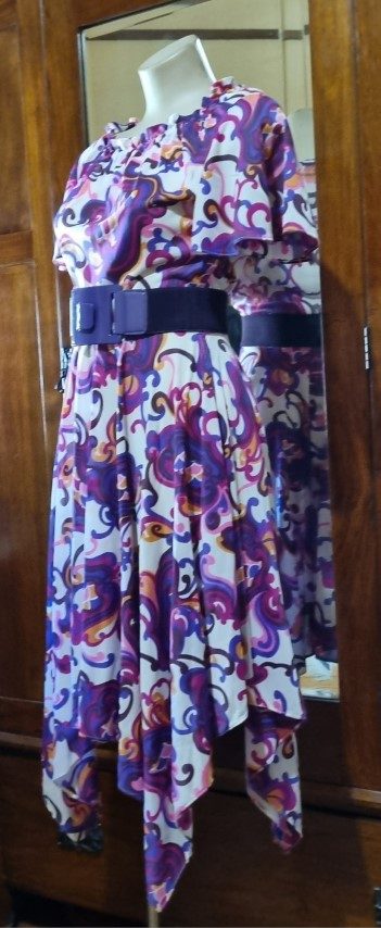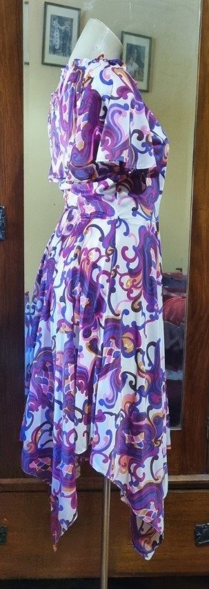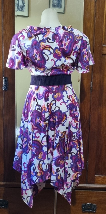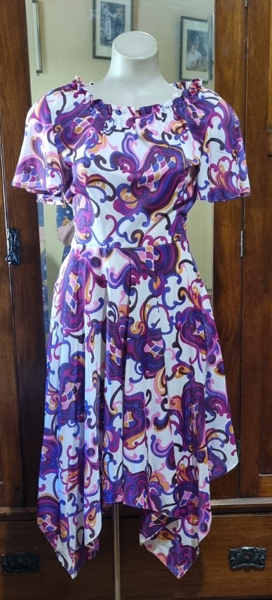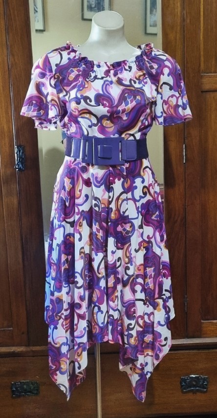 1970’s, Handkerchief Hem Dress & belt, white print, handmade, polyester, size S