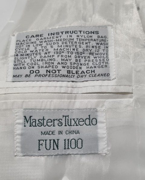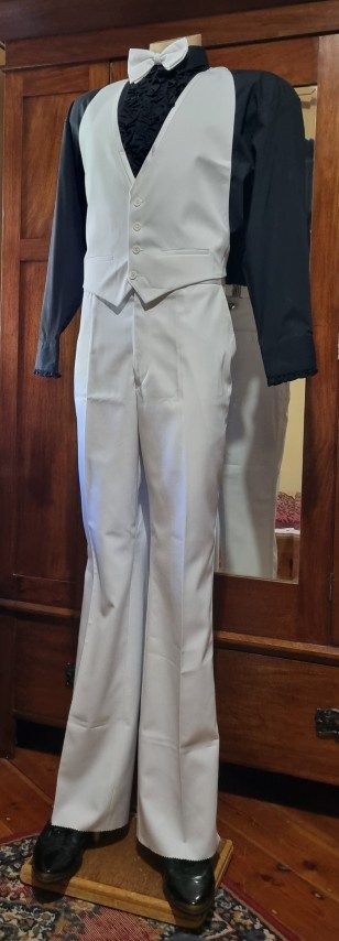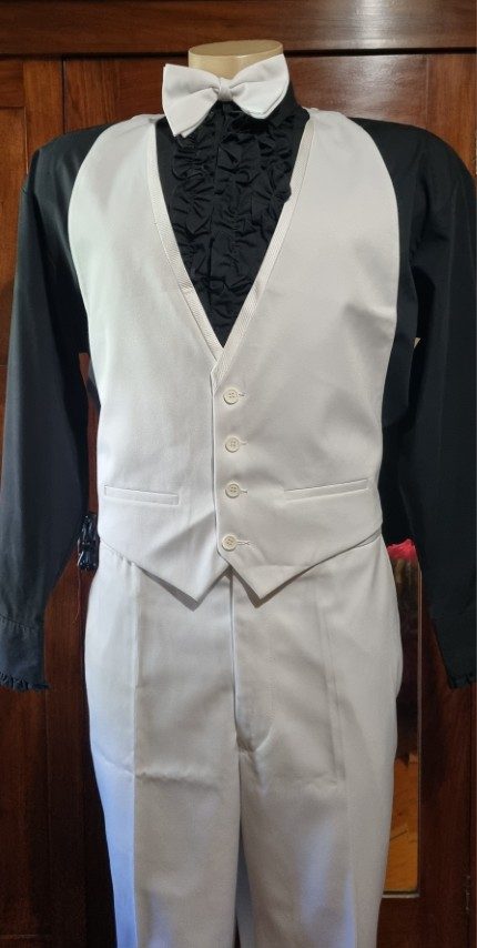 How much fun is this suit! It has the look of a tuxedo, but with slightly flared pants. It includes, jacket, pants, half vest and bow tie. The ruffle shirt and shoes in the photos are not included.