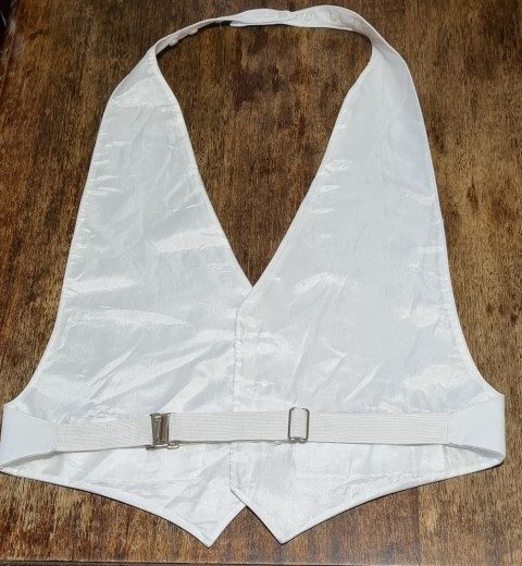 The vest only has fabric at the front, which measures in the waist 40″, or slightly bigger if needed, this to has an adjustable waist. The length is 25″.