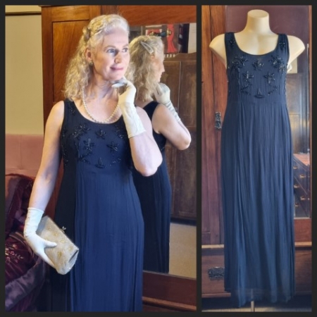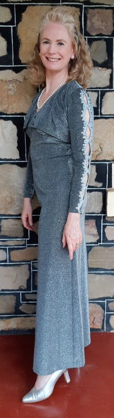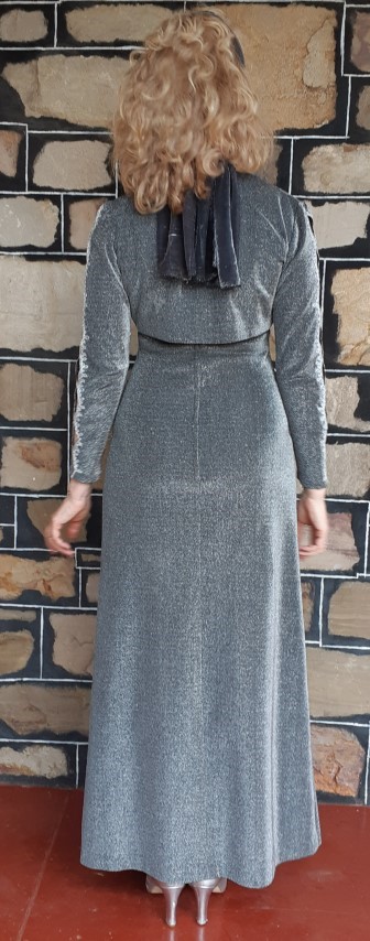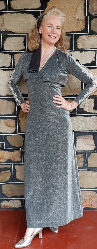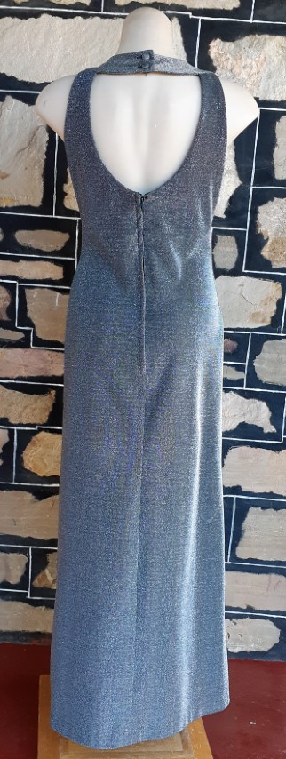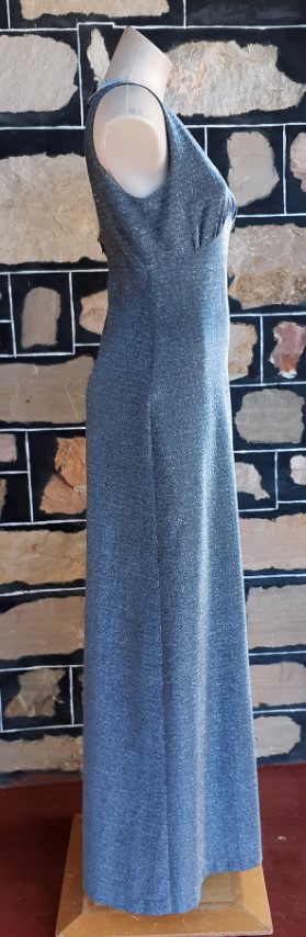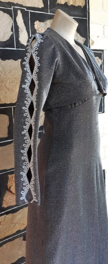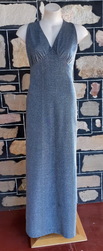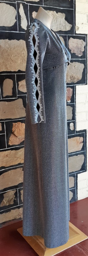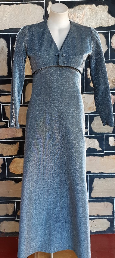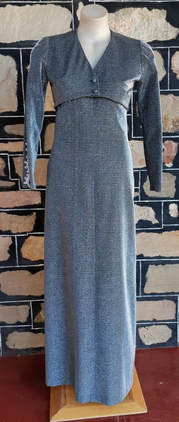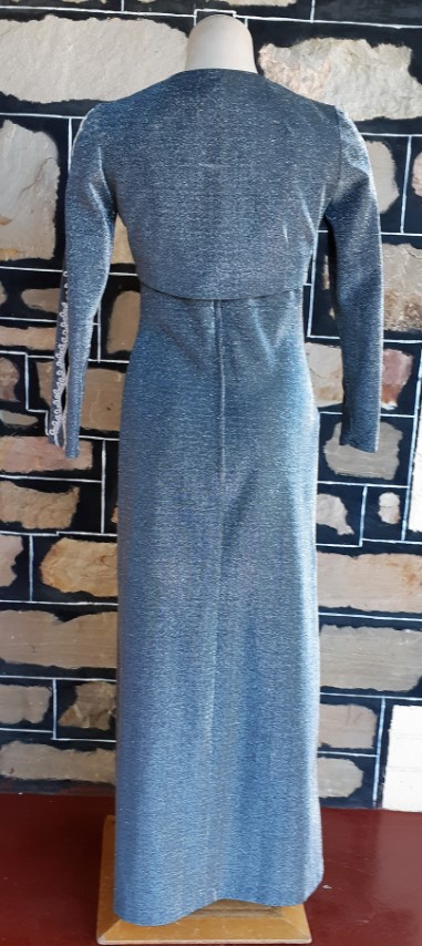 1970’s, Lurex Maxi dress & Bolero Jacket, polyester, silver, Size 12