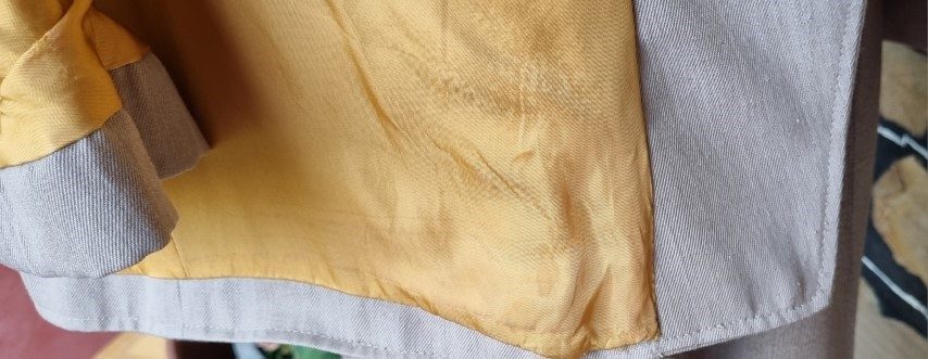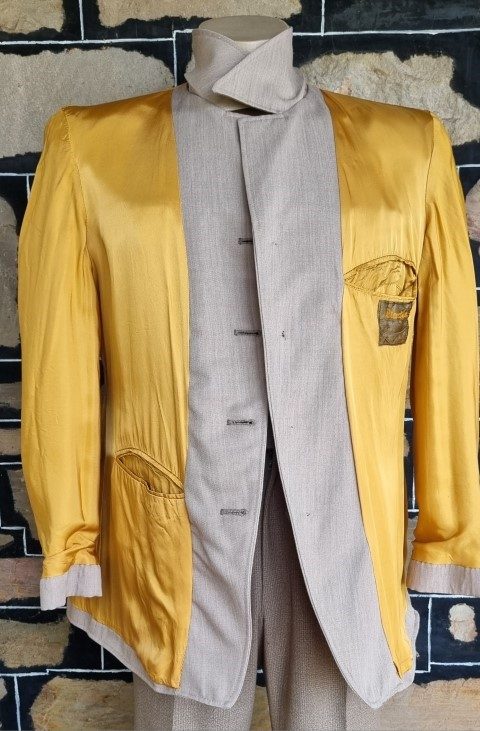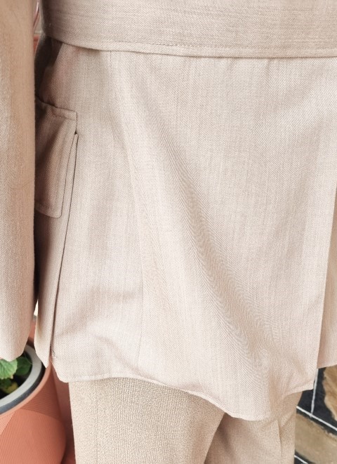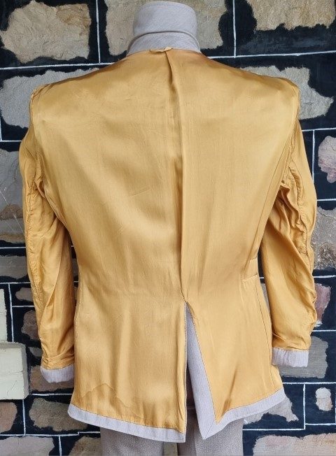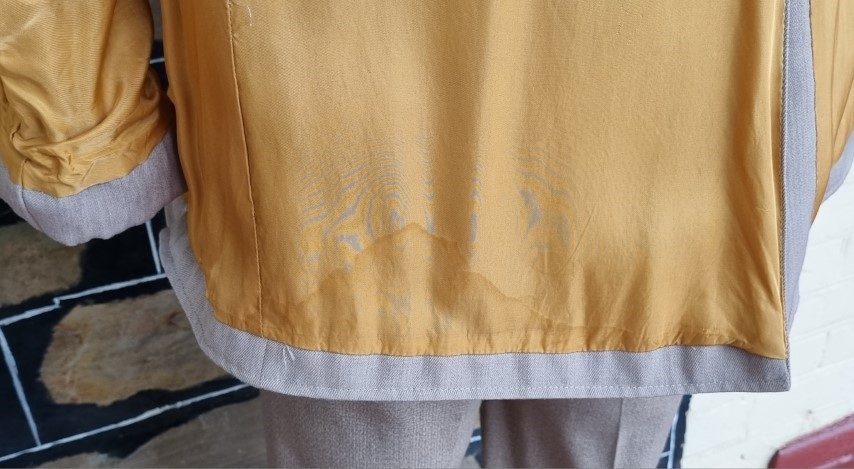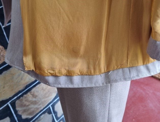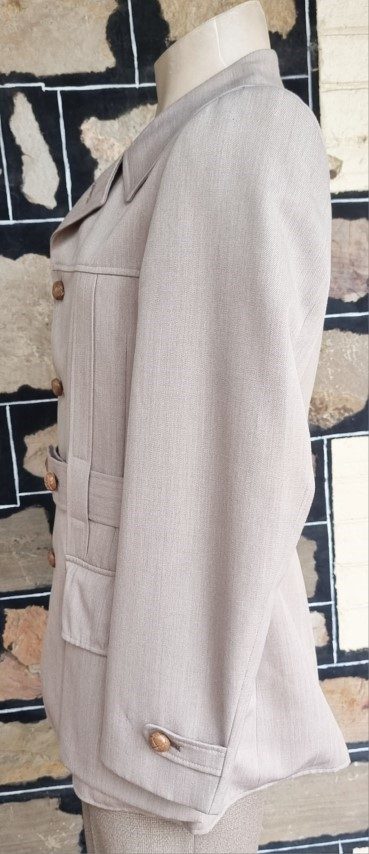 The awesome quality of this beautifully tailored jacket. It is 55% polyester and 45% wool. It is fully lined. It has been freshly laundered, but, unfortunately the satin lining has shrunk a tad, so the hem is now puckered. To fix this problem the lining will need to be undone, and restitched. For this reason I have priced the Jacket 20% lower to compensate.