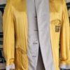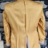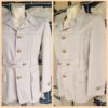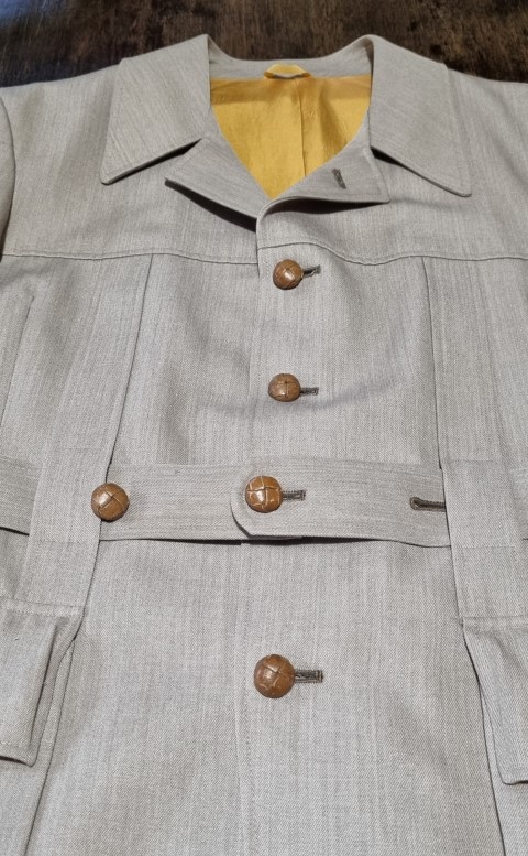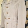 In a flat lay the chest is 46″, the waist is 40″, the hips are 45″, the length is 29.5″ and the shoulder span is 19″. The buttons are leather and are all present. The waist can be made a little smaller by buttoning up the belt on the alternative button.